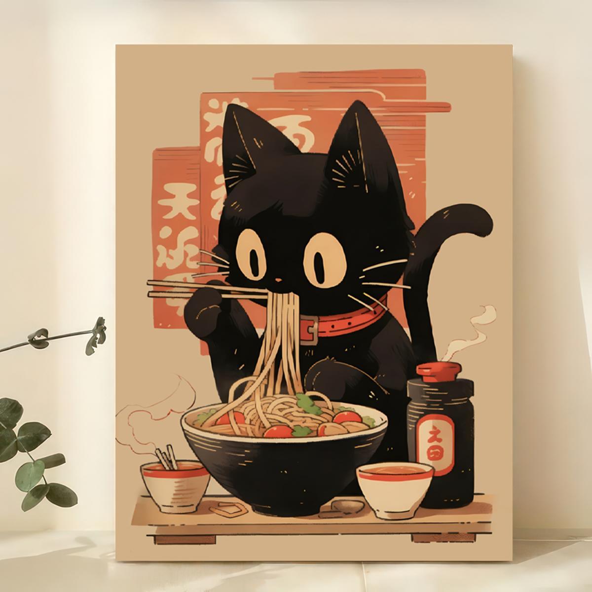 Póster de arte con impresión en lienzo de ramen de gato negro, decoración de pared moderna retro con patrón animal y retrato