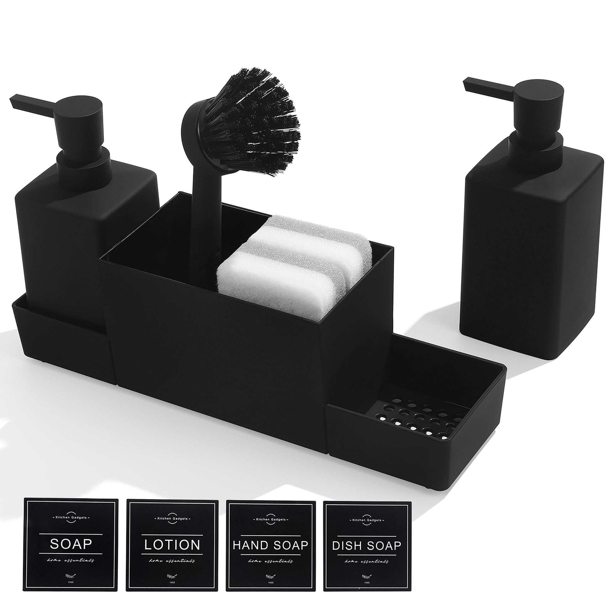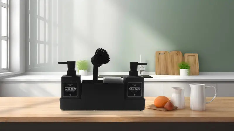 Dispensador de jabón doble negro con soporte para esponja y cepillo para platos para fregadero de cocina