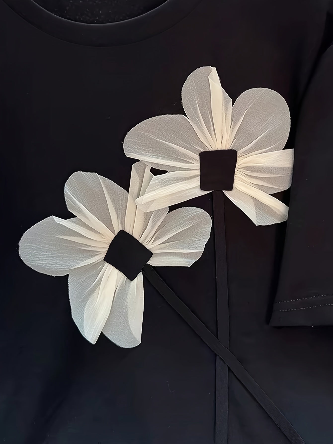 Camiseta de mujer negra con estampado floral, cuello redondo, manga corta, poliéster elástico, casual, verano