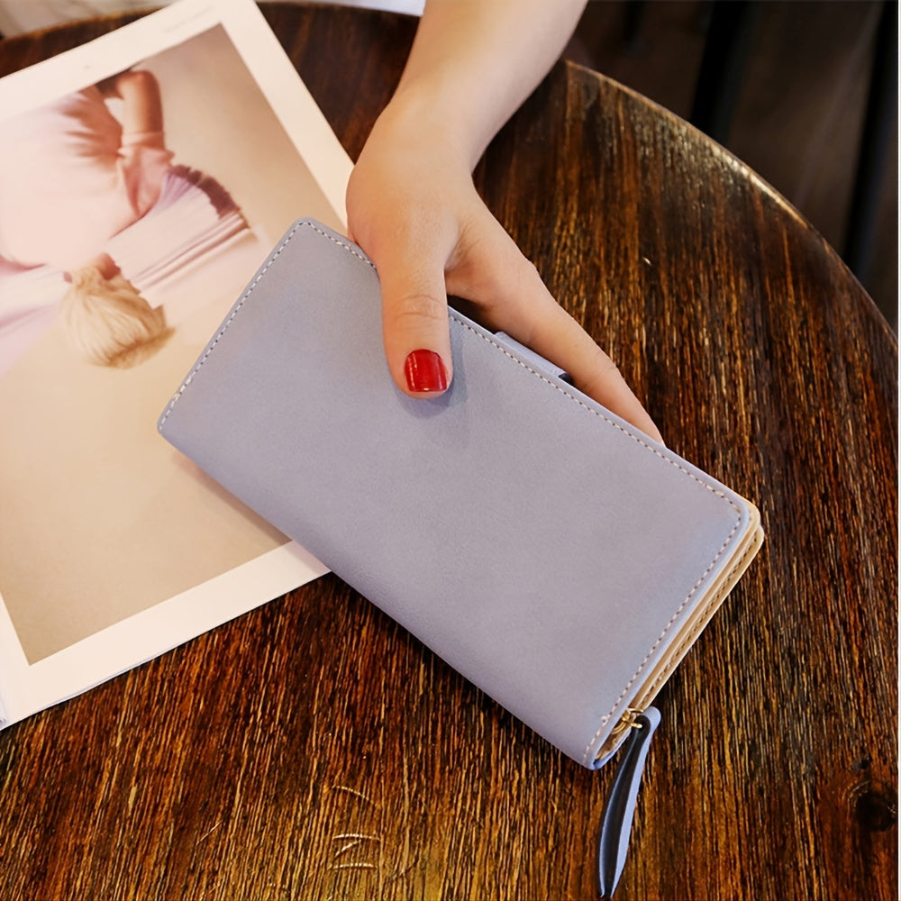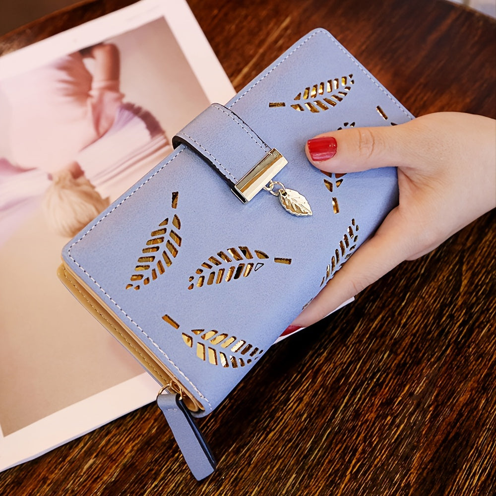 Cartera femenina de cuero sintético negro con diseño de hoja de oro, tarjetero, monedero y cierre a presión