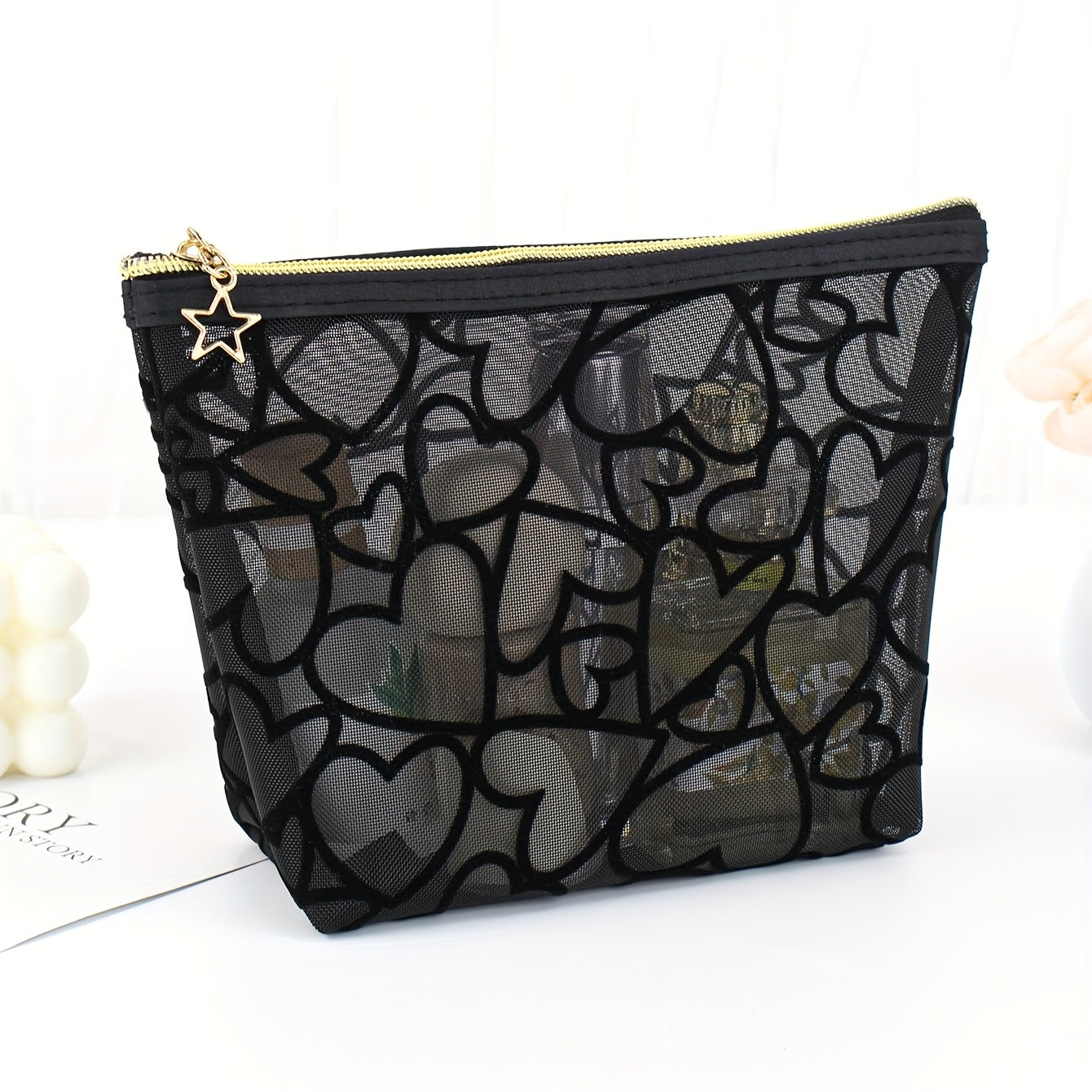 Necesero de malla impermeable negro para maquillaje unisex con gran capacidad y cierre de cremallera