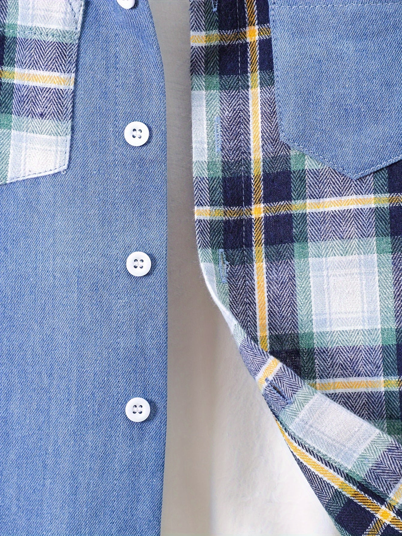 Camisa de mezclilla de manga larga a cuadros para niños, corte regular, para todas las estaciones, de poliéster y algodón tejidos