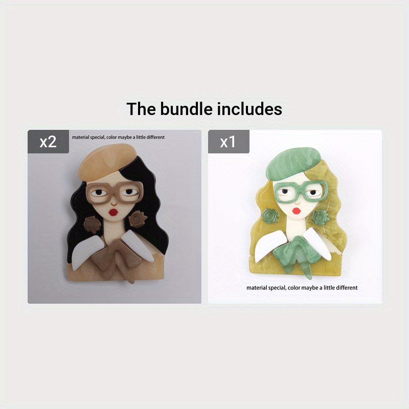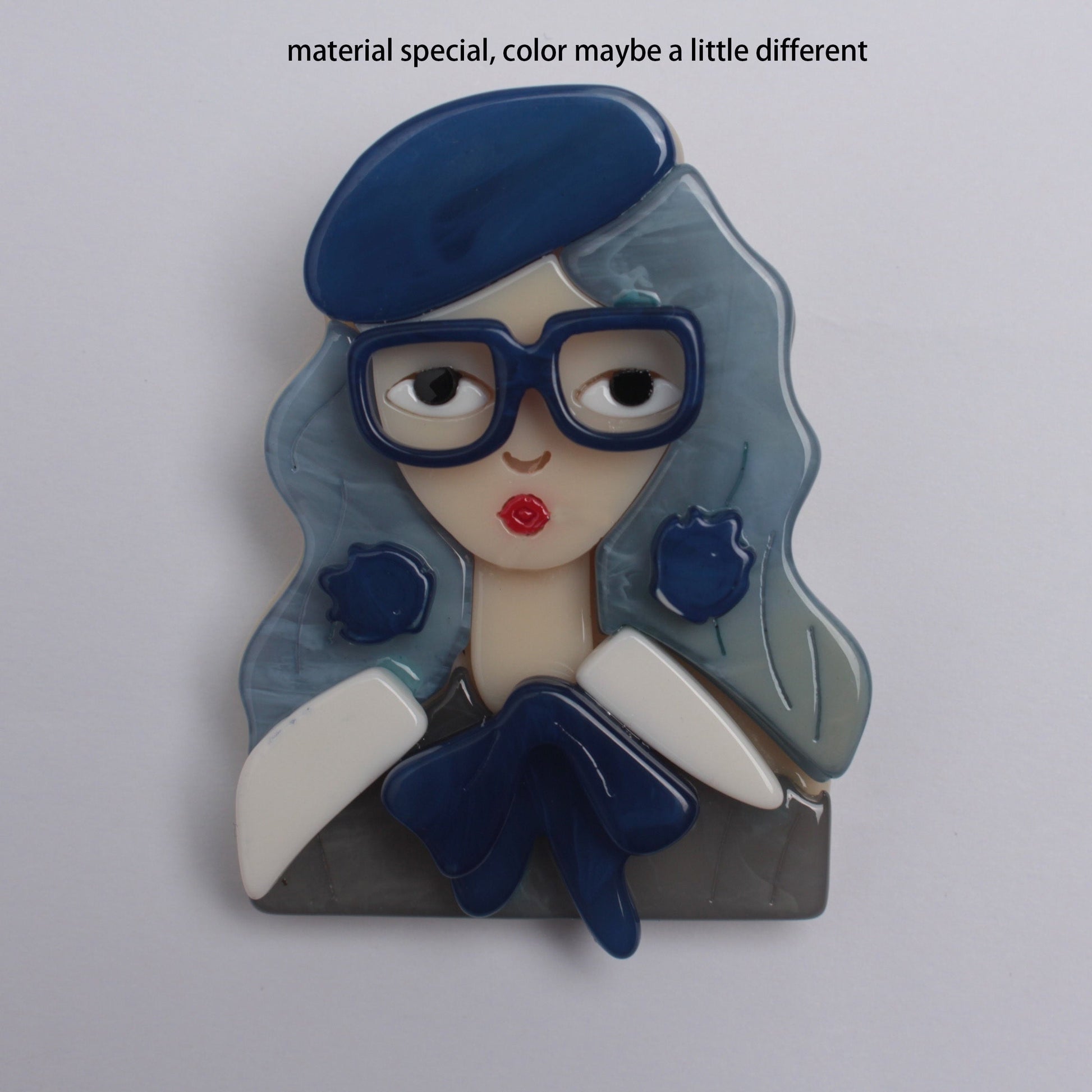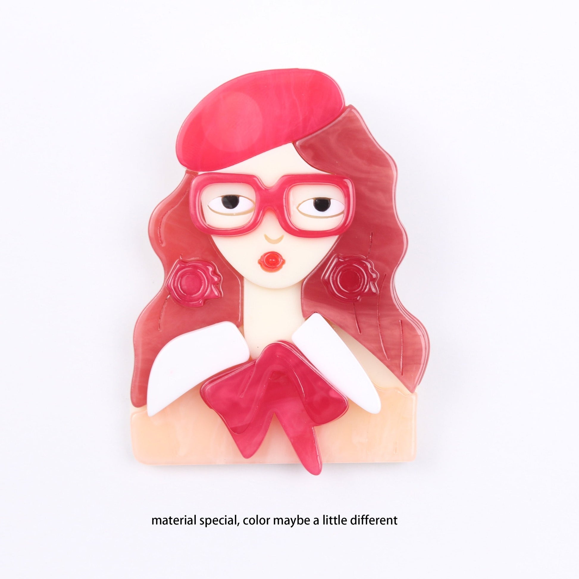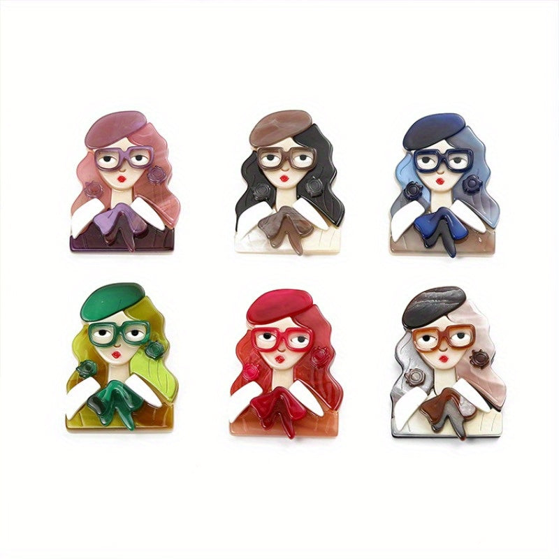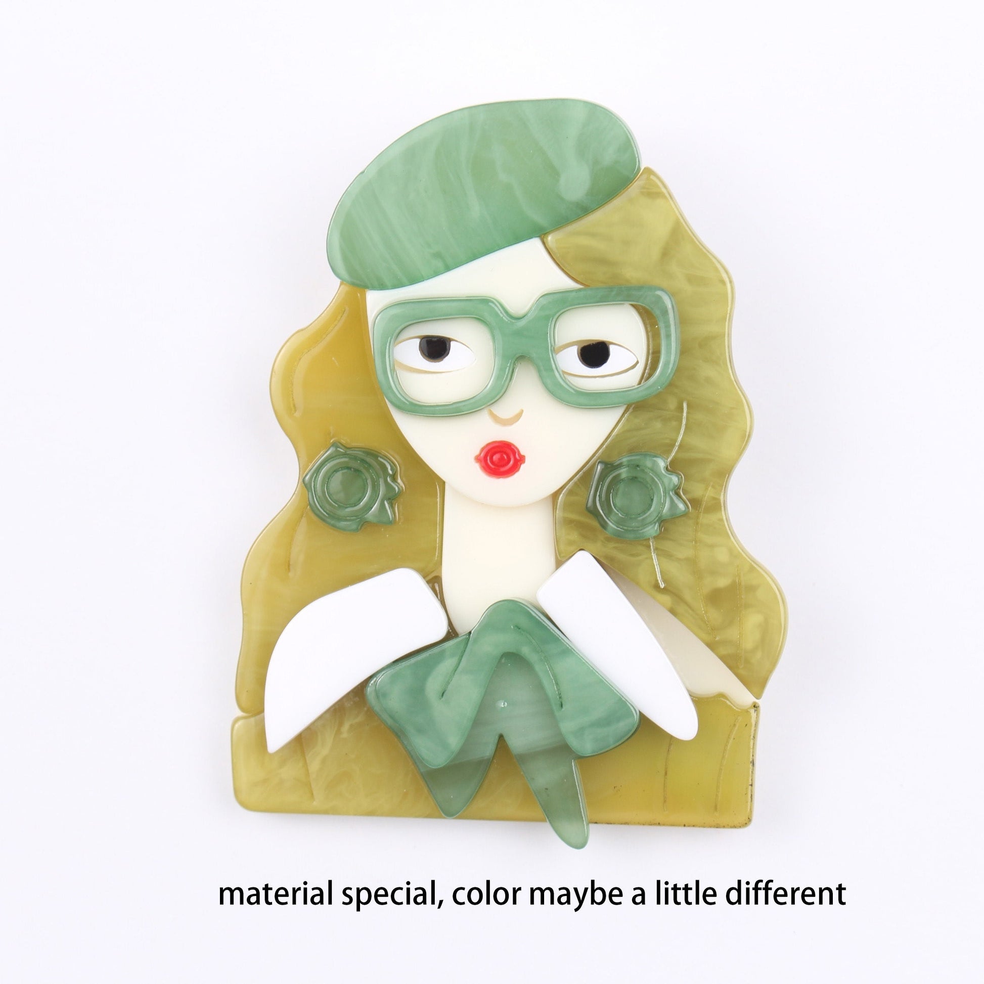 Broche de chica acrílica con gafas, joyería original y elegante para vestidos, suéteres y abrigos