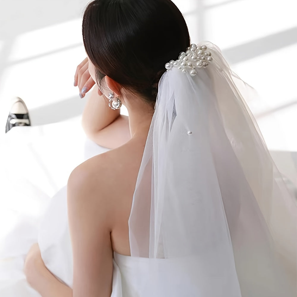 Pin de cabello nupcial con perla falsa y velo de doble capa para mujeres