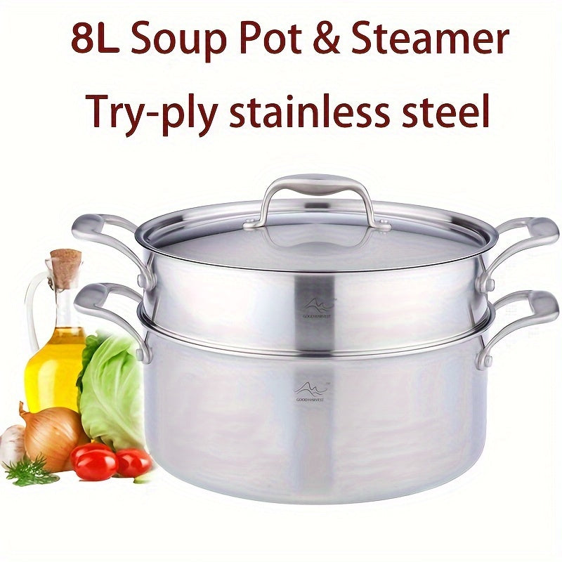 Juego de ollas de sopa de acero inoxidable con vaporera, 8L, compatible con inducción, apto para lavavajillas