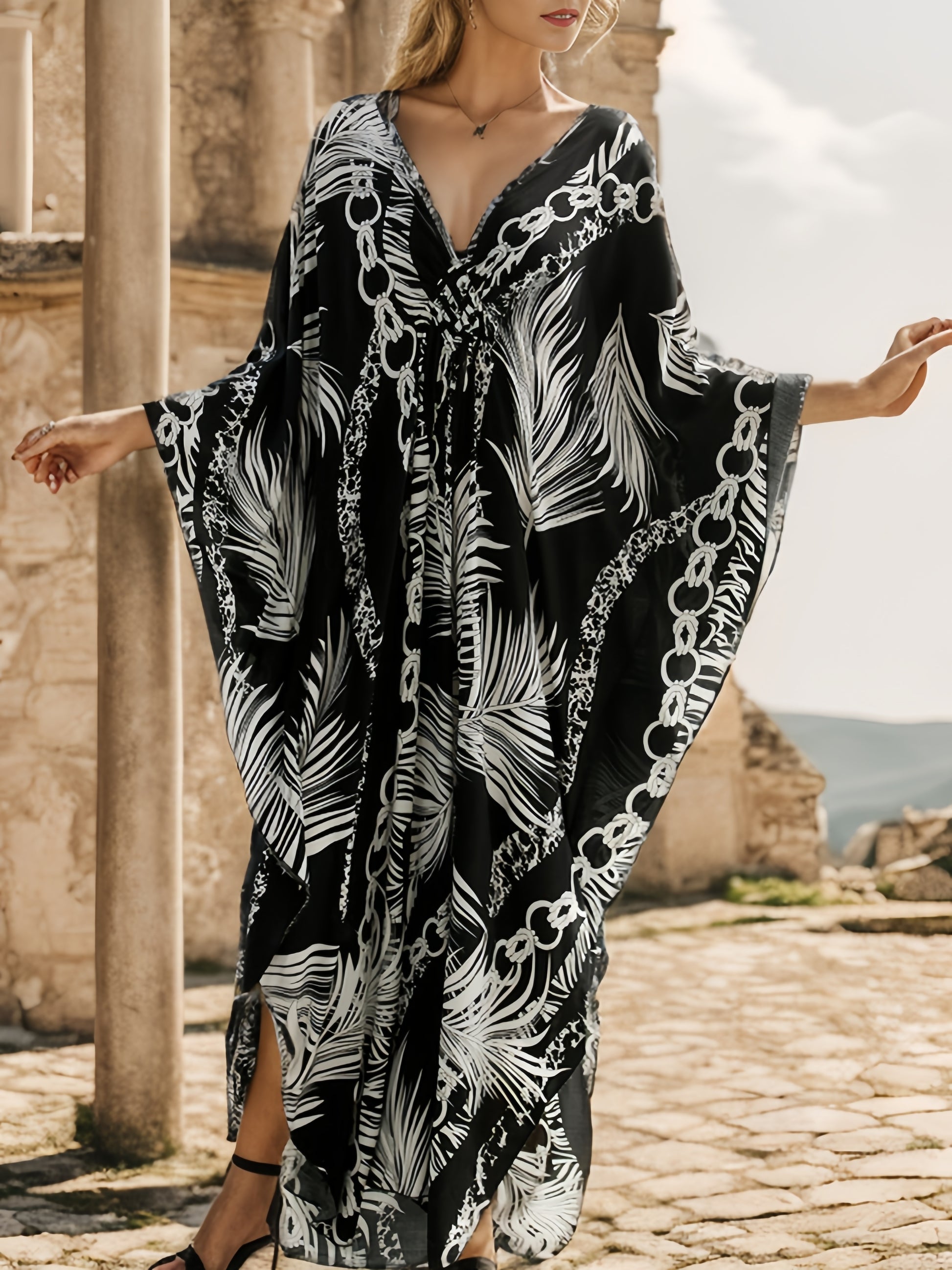 Vestido de playa boho de talla grande con escote en V y patrón tropical con detalle de abertura en 100% viscosa