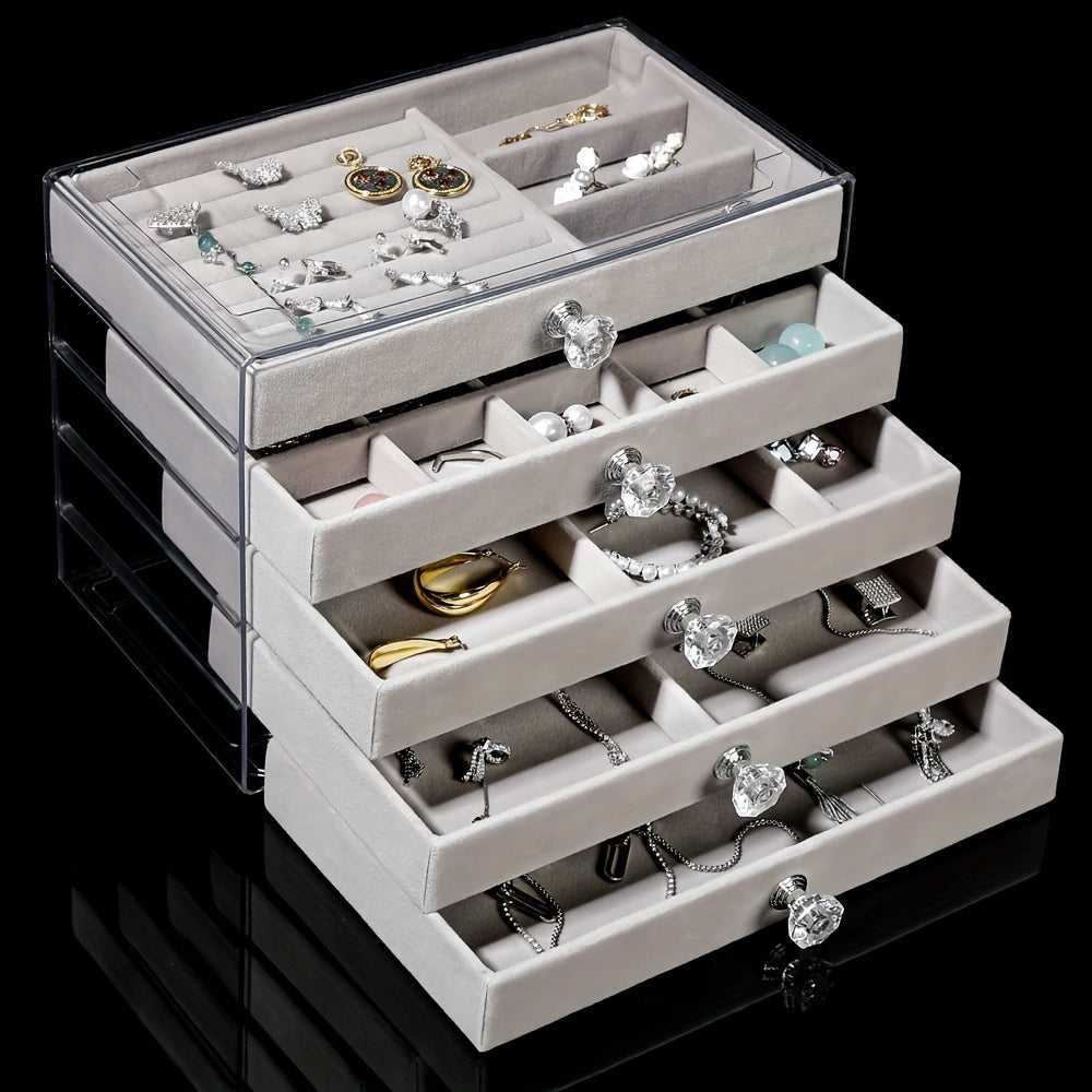 Caja de joyería de cinco capas con cajones para anillos, pendientes, pulseras y relojes. Almacenamiento de plástico con interior de tela