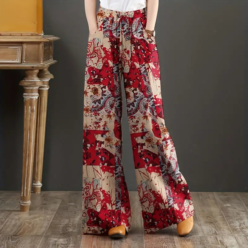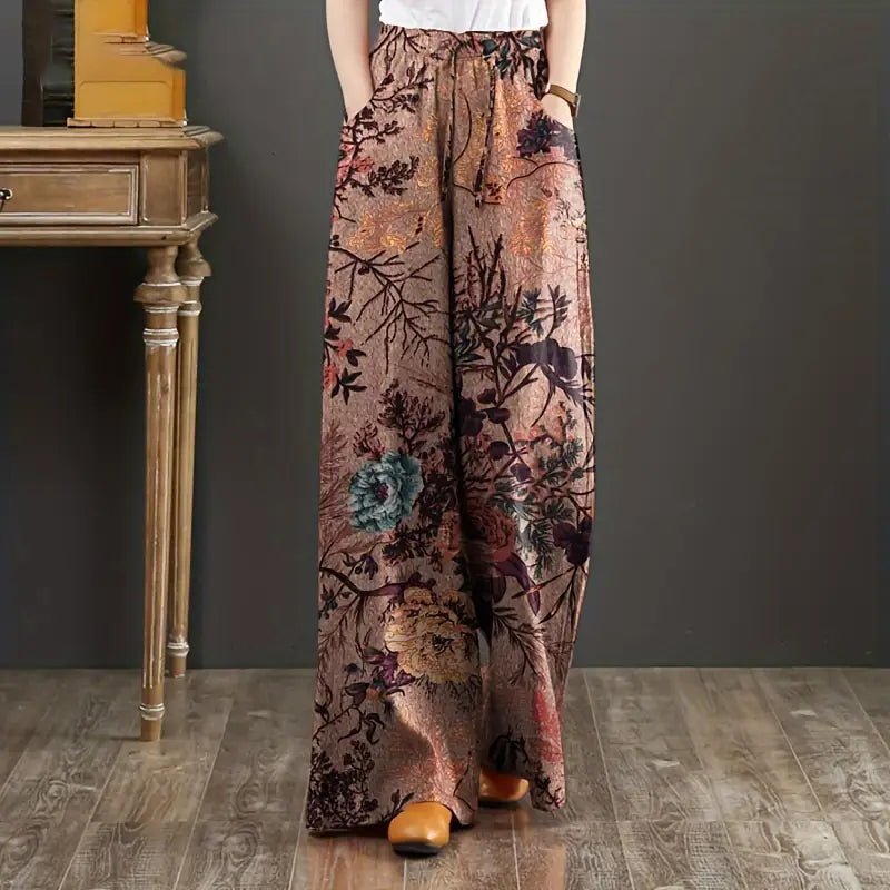 Pantalones anchos de algodón con estampado floral para mujer, cintura elástica, cordón ajustable, largos, para todas las estaciones, casual