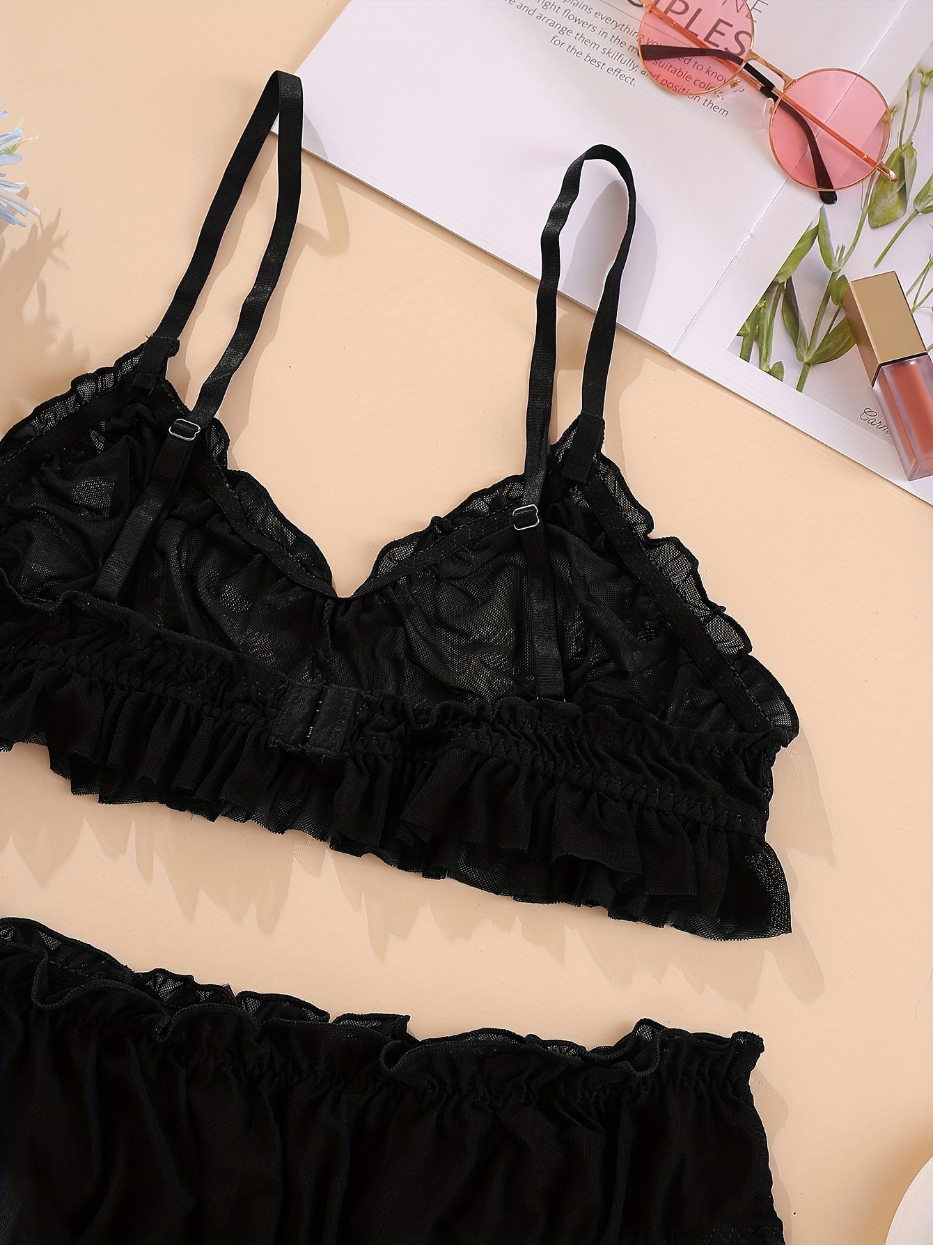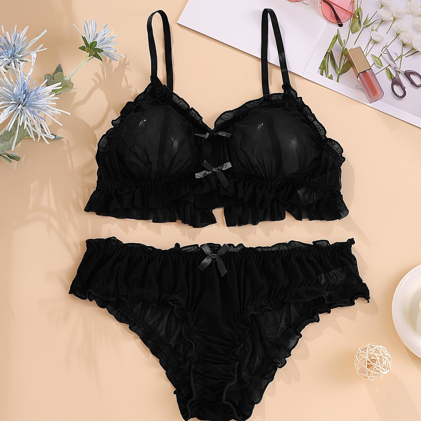 Conjunto de lencería floral de encaje para mujer con ribete de volante y sujetador y braga en triángulo adornados con lazo