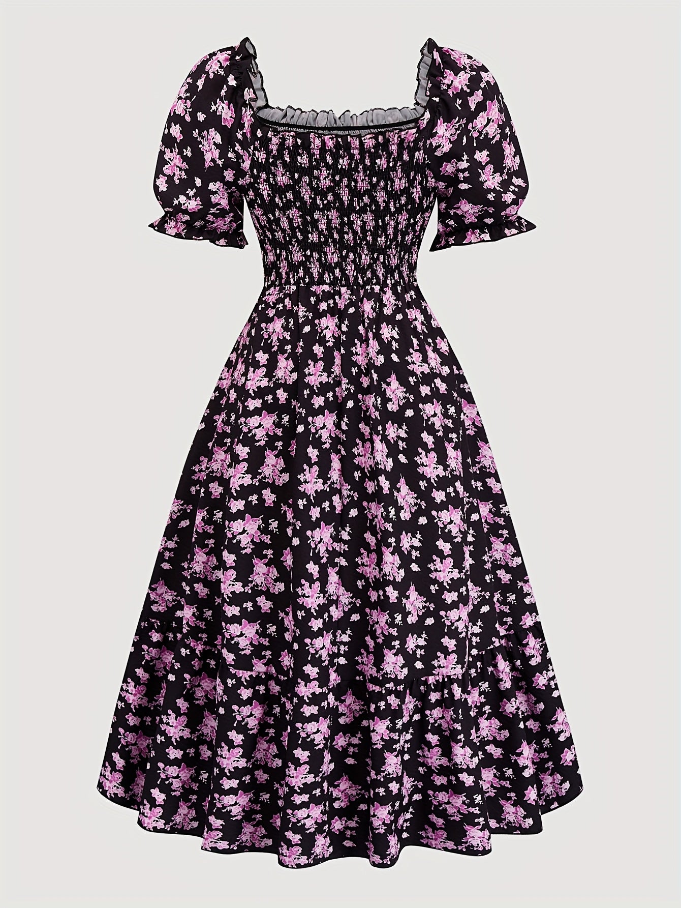 Vestido de talla grande con estampado floral, cintura fruncida, escote cuadrado, mangas cortas y lazo frontal