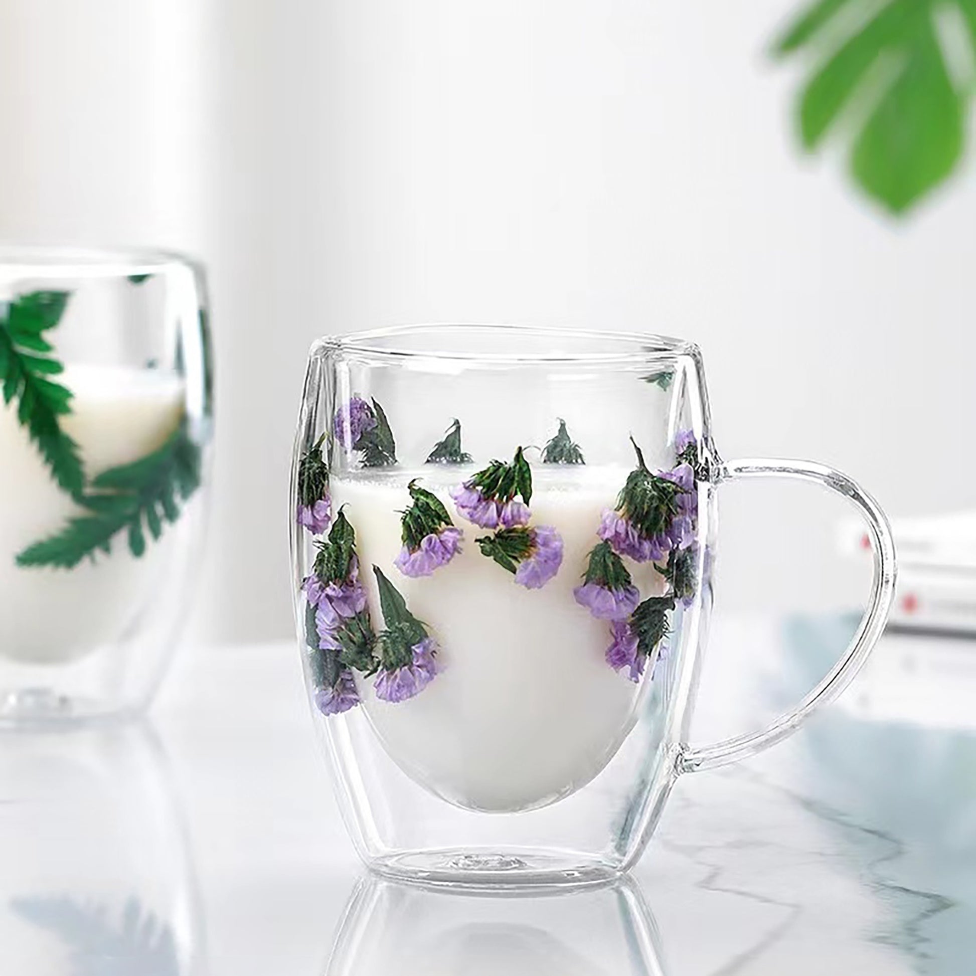 Taza de café de vidrio con flores secas, taza de doble pared para espresso y bebidas calientes