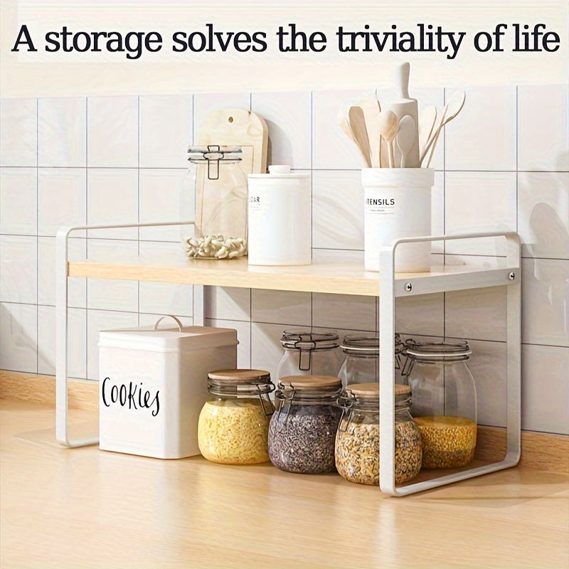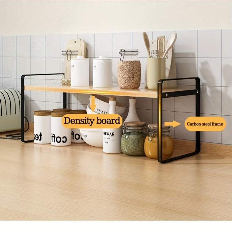 Estante de cocina con marco de hierro y tapa de madera dura con 2 niveles para organización