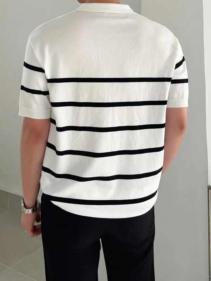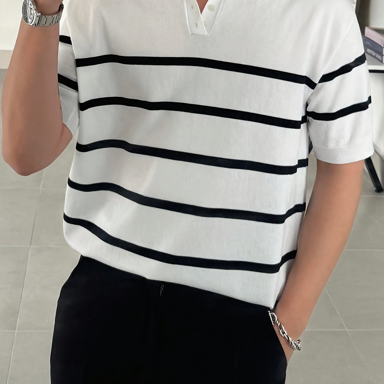 Camisa de punto casual de rayas para hombre, manga corta, ligera, verano, mezcla de viscosa y poliéster, blanco y negro