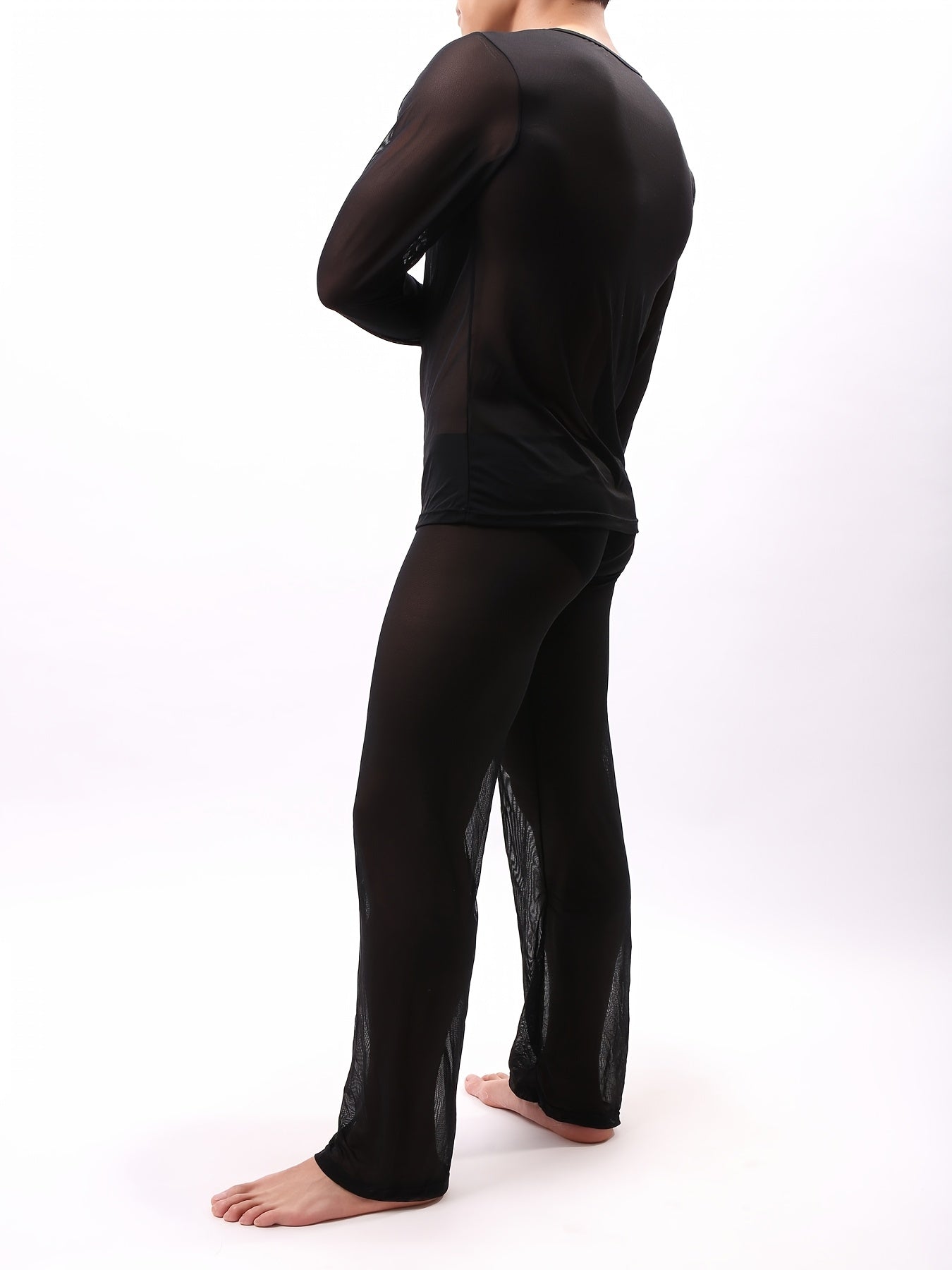 Conjunto de ropa de descanso de manga larga y tela transparente para hombre, de color sólido, poliéster y spandex