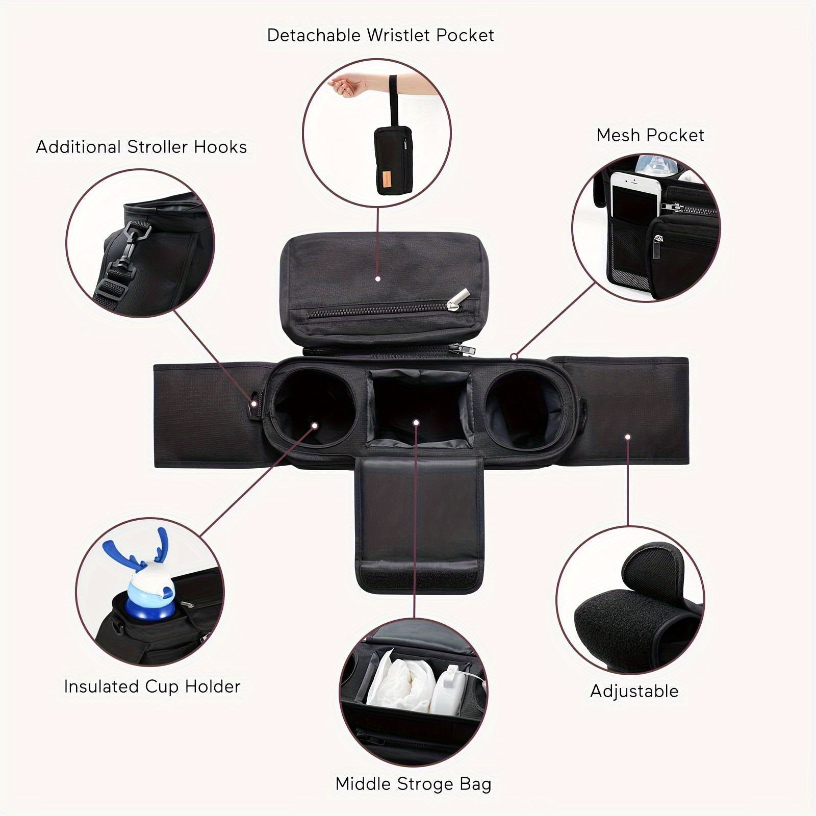 Organizador multifuncional para cochecito con portavasos aislado, bolsillo para teléfono y correa para el hombro