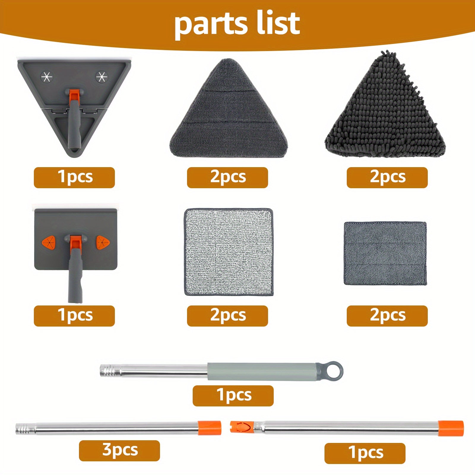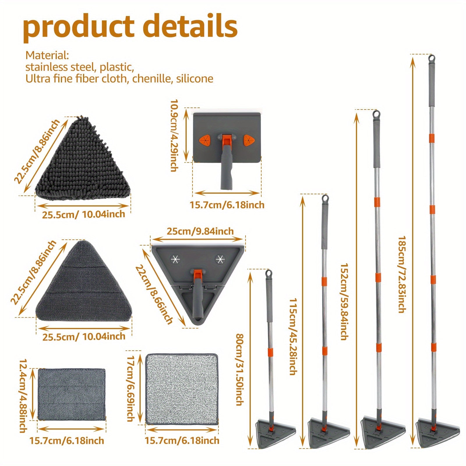 Un trapeador para limpiar paredes con cabezales de trapeador triangulares y rectangulares, que cuenta con un diseño de raspador y rotación de 360° para una limpieza efectiva. El mango largo desmontable permite limpiar fácilmente áreas altas y bajas. Incluye 8 paños de trapeador suaves y reutilizables, adecuados para limpiar pisos, paredes, techos y otras superficies.