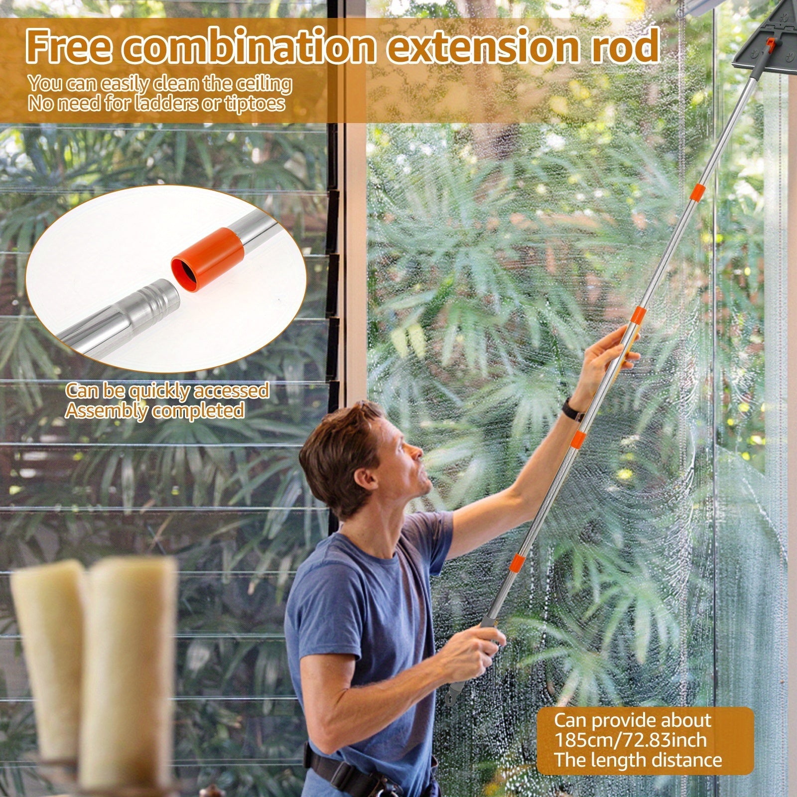 Este trapeador para limpiar paredes incluye un conjunto de 5 secciones de mangos extensibles que se pueden conectar fácilmente a la cabeza del trapeador para un montaje rápido. El mango está diseñado ergonómicamente para un agarre cómodo. Se extiende hasta aproximadamente 185 cm, lo que facilita limpiar áreas altas o bajas. La longitud se puede ajustar según sus necesidades de limpieza, permitiéndole limpiar el techo sin necesidad de una escalera o ponerse de puntillas.