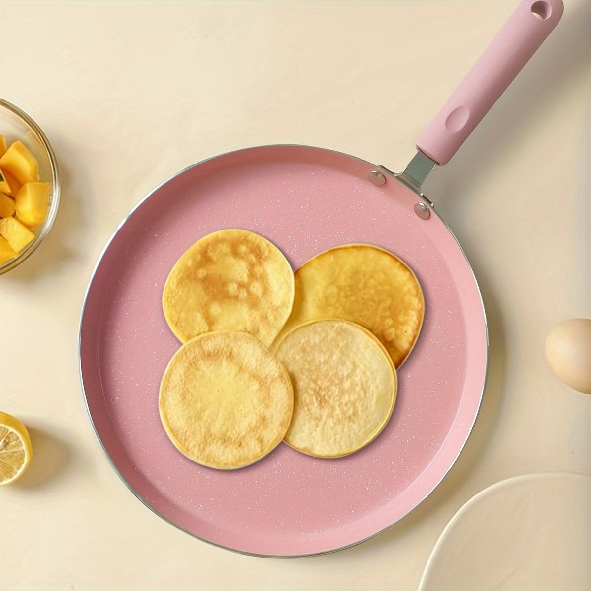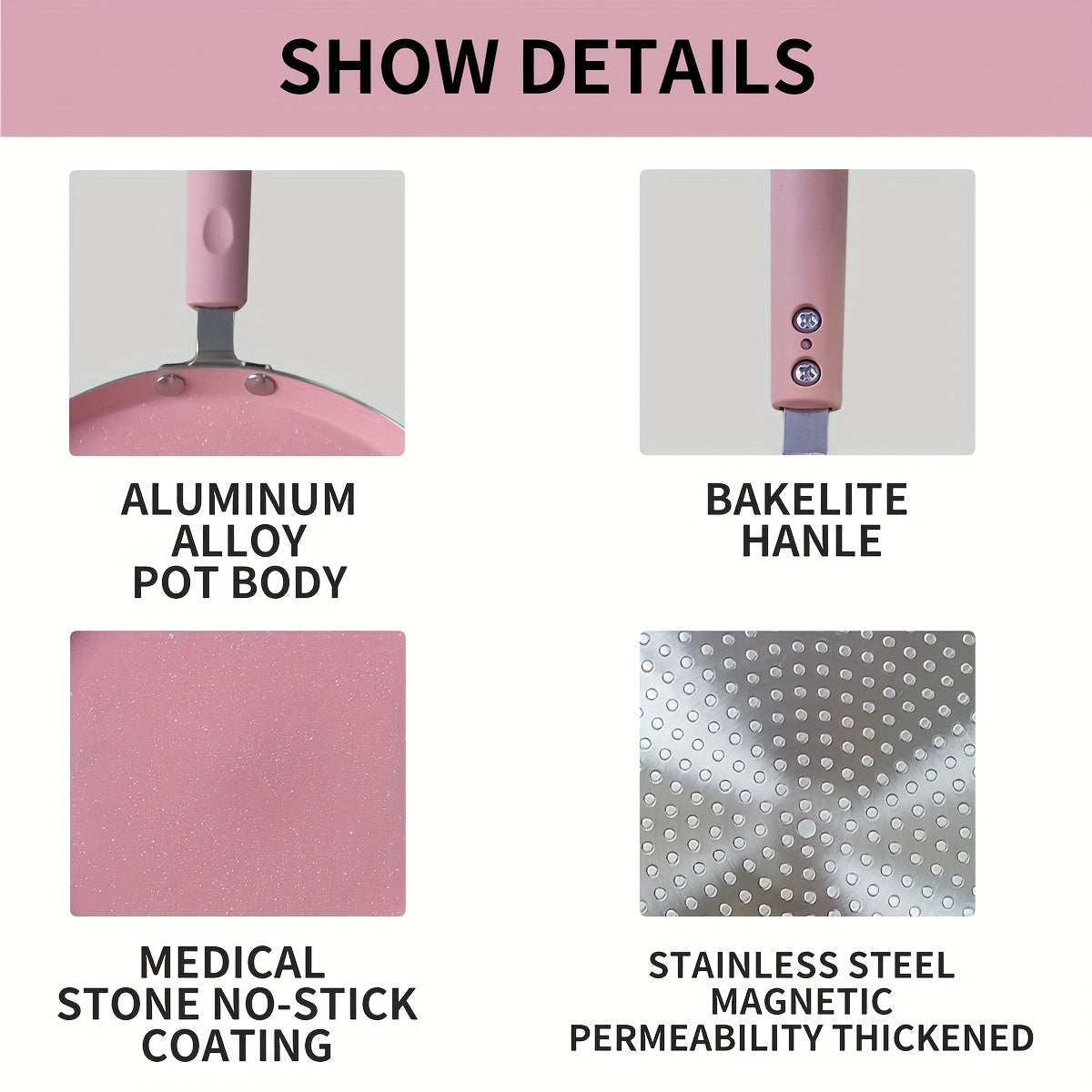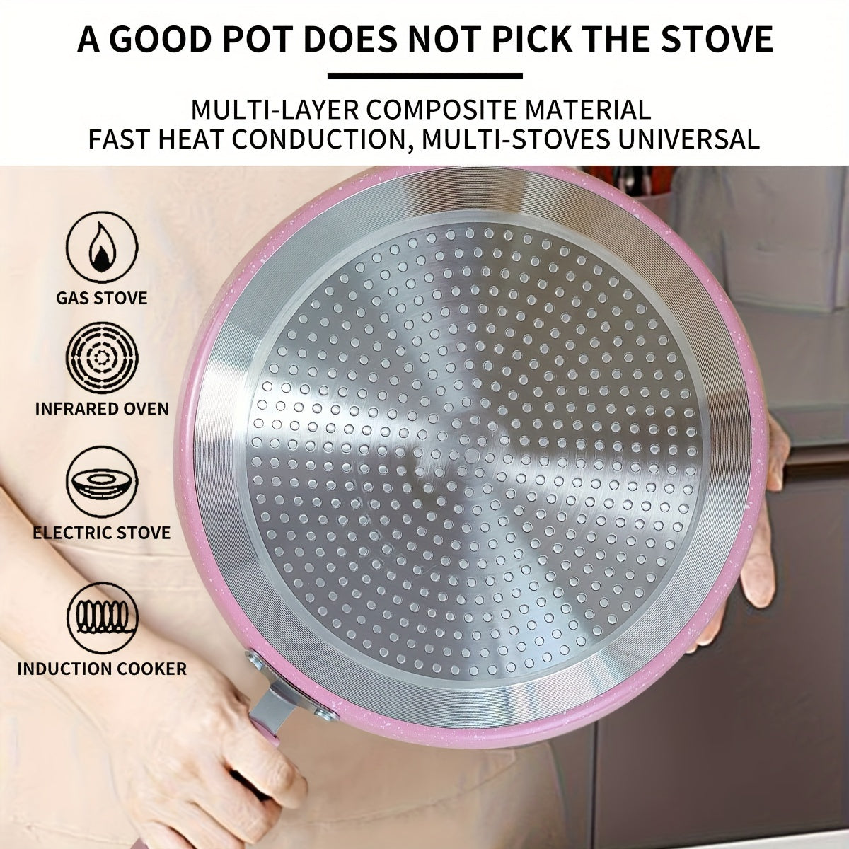 Sartén de aluminio antiadherente rosa con acabado en piedra mica, mango de madera, apta para lavavajillas, compatible con resistencias eléctricas