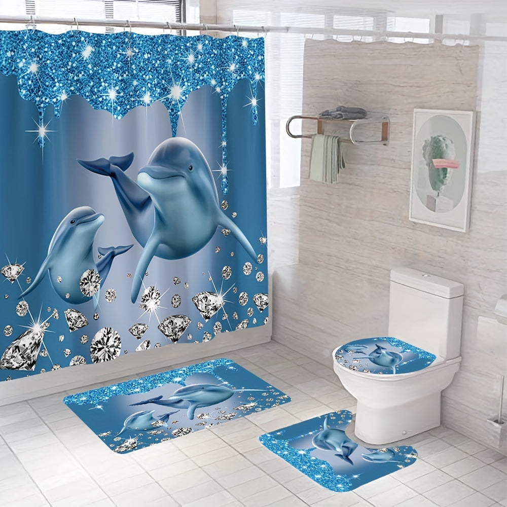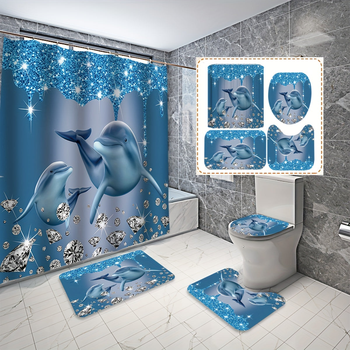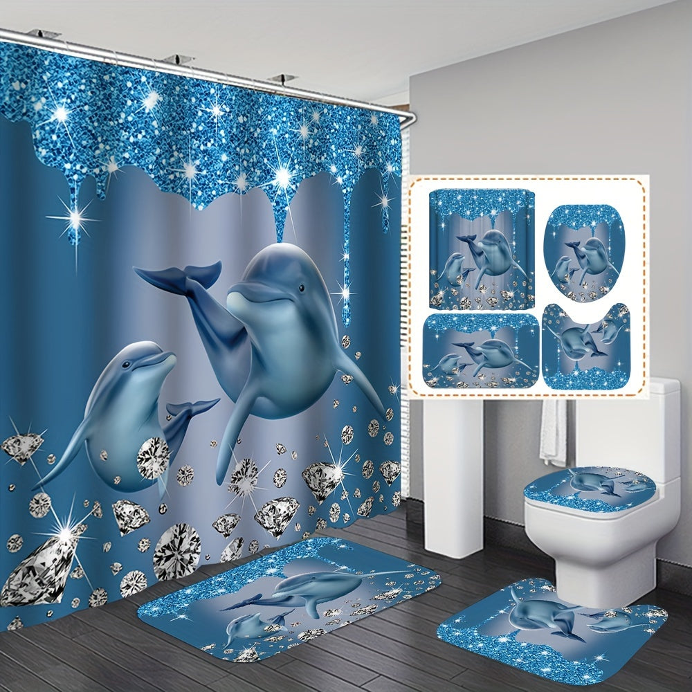 Conjunto de cortina de ducha Ocean Dolphin con diseño de dibujos animados en 3D, tela tejida de poliéster, alfombra antideslizante, cubierta de inodoro y ganchos