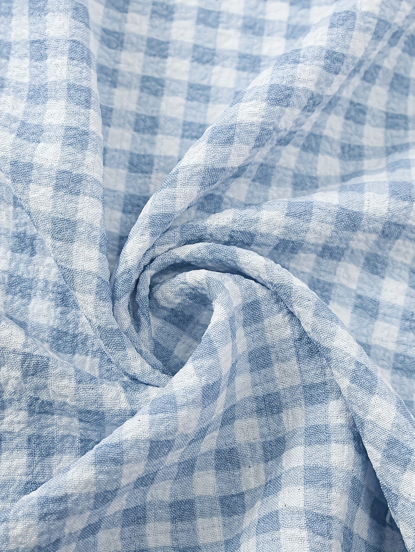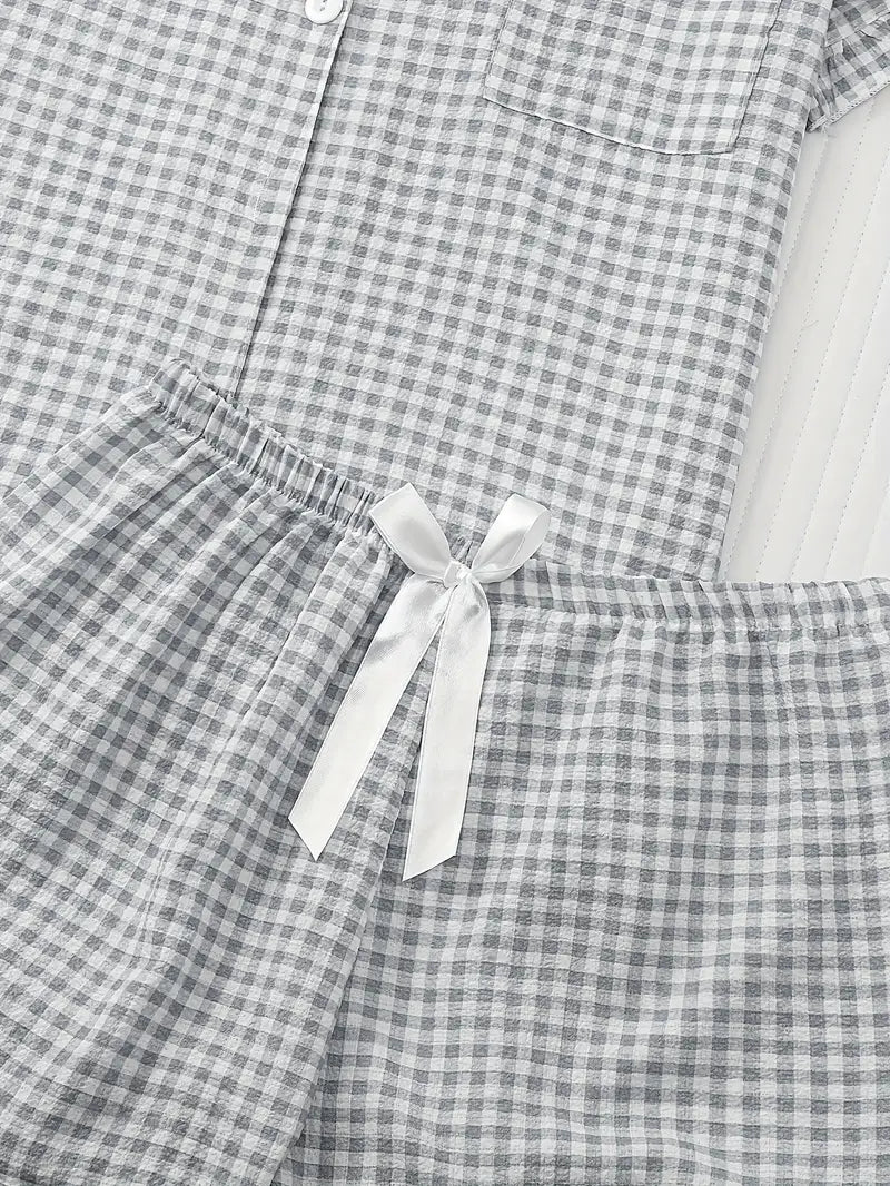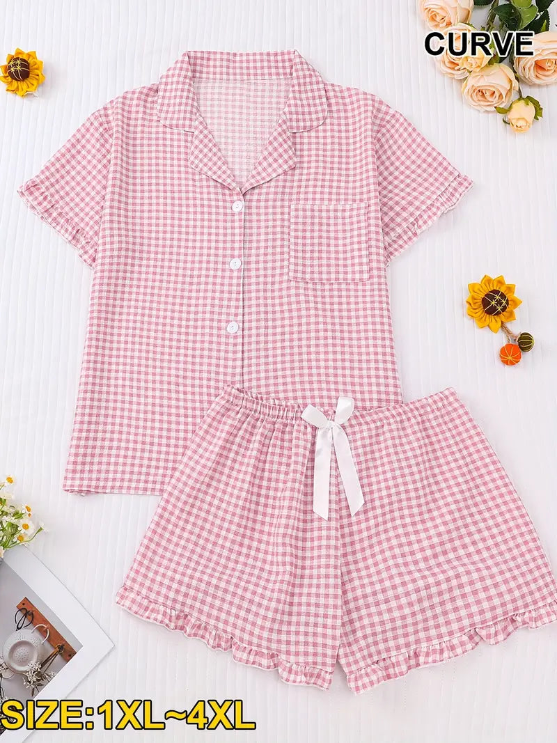 Conjunto de pijama de verano talla grande con ribete de volantes, manga corta y botones a cuadros