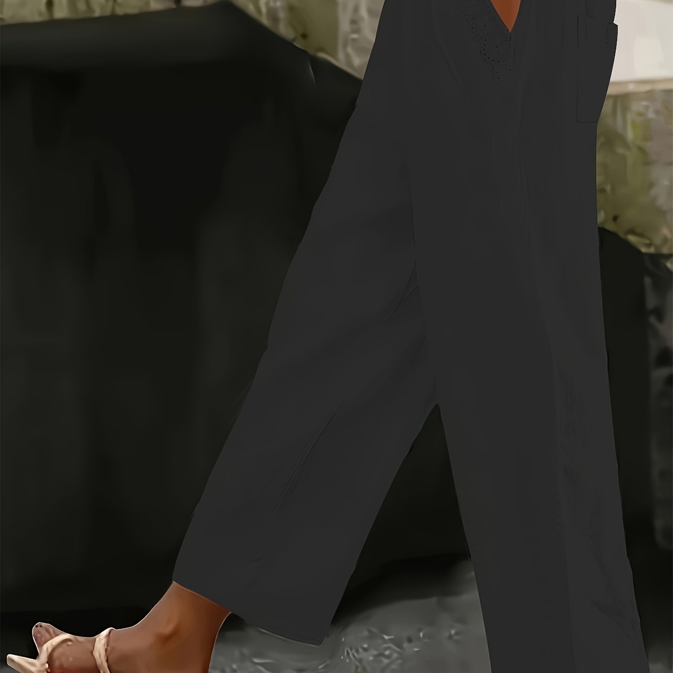 Pantalones de pierna ancha de talla grande con bolsillos con ribete de encaje, color sólido, casual, para todas las estaciones