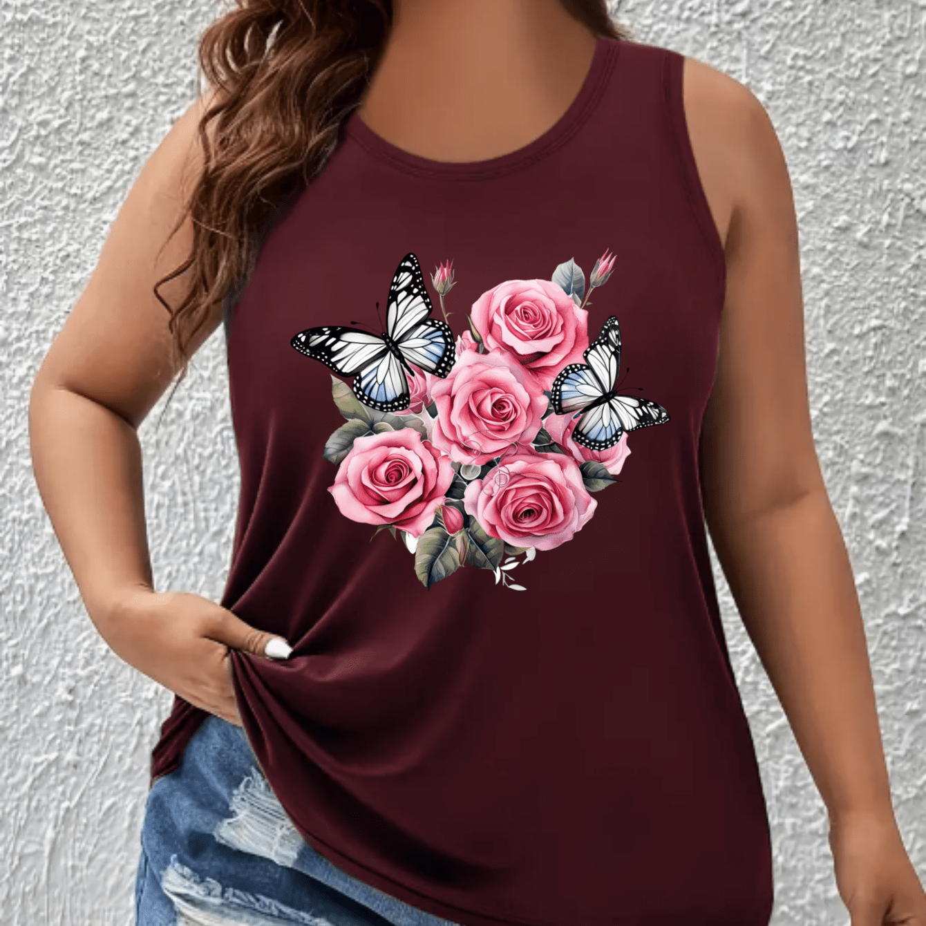 Top sin mangas de verano casual para mujer talla grande con estampado de mariposas y flores