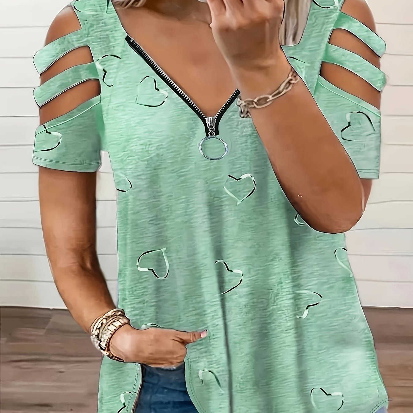 Camiseta casual de manga corta con estampado de corazones para mujer talla grande con media cremallera