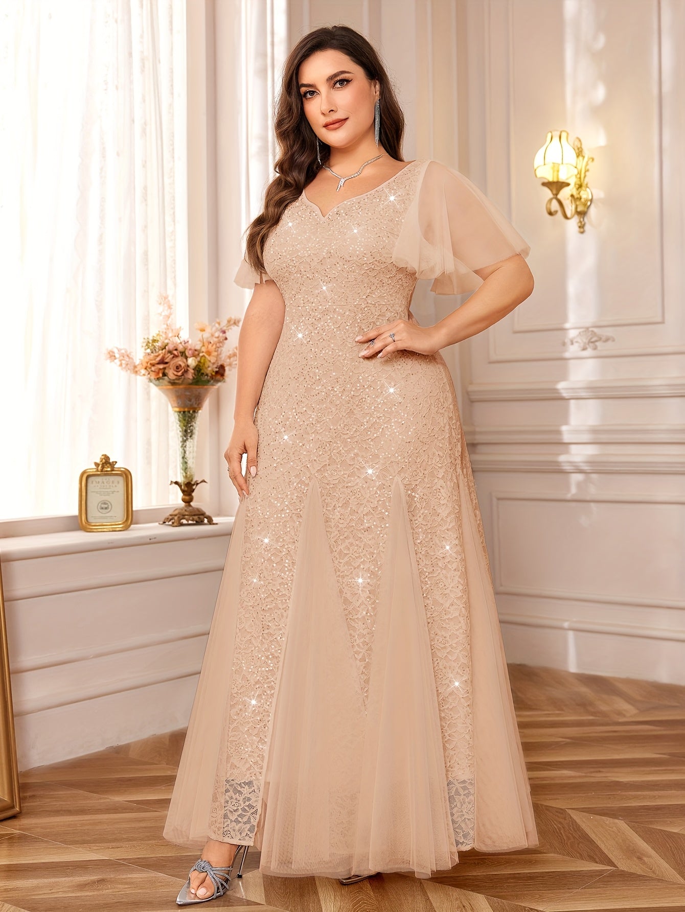Vestido largo de encaje para mujer talla grande sin mangas con escote en V y dobladillo acampanado para boda