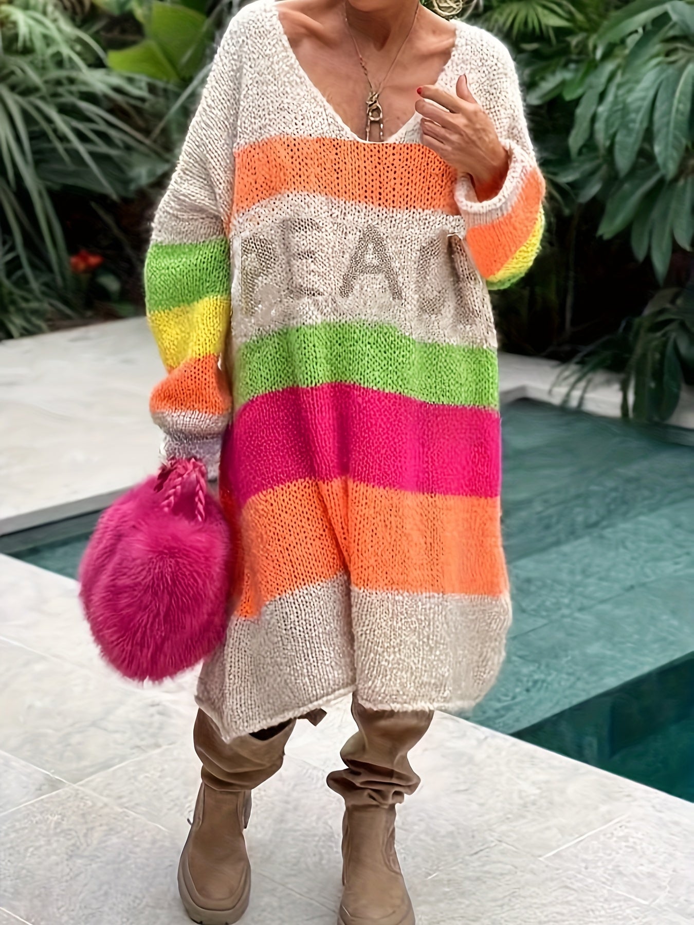 Vestido de punto con escote en V para mujer talla grande con rayas coloridas, casual, oversize, para otoño e invierno