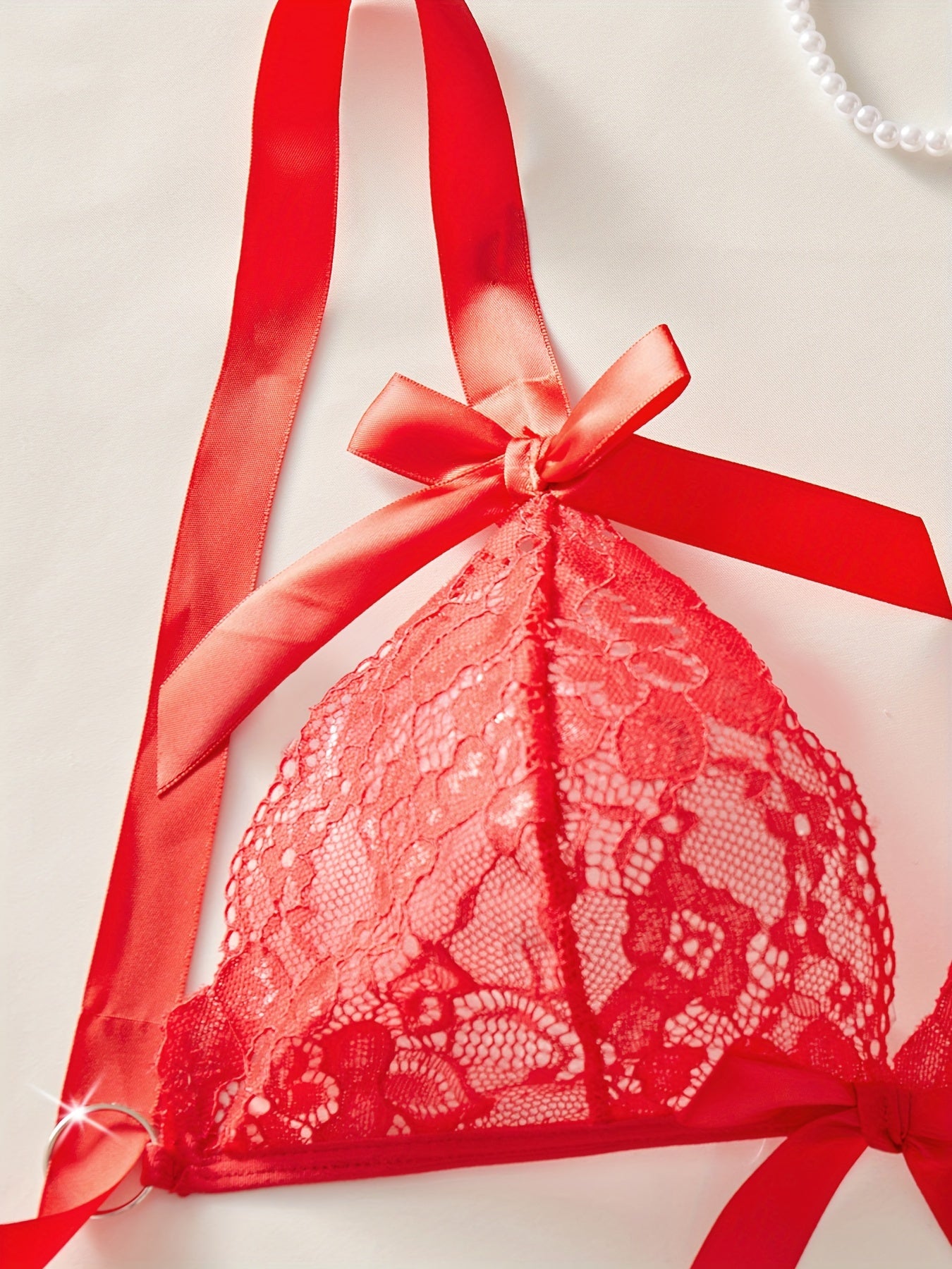 Conjunto de lencería de encaje rojo con diseño floral y decoraciones de lazo para mujeres