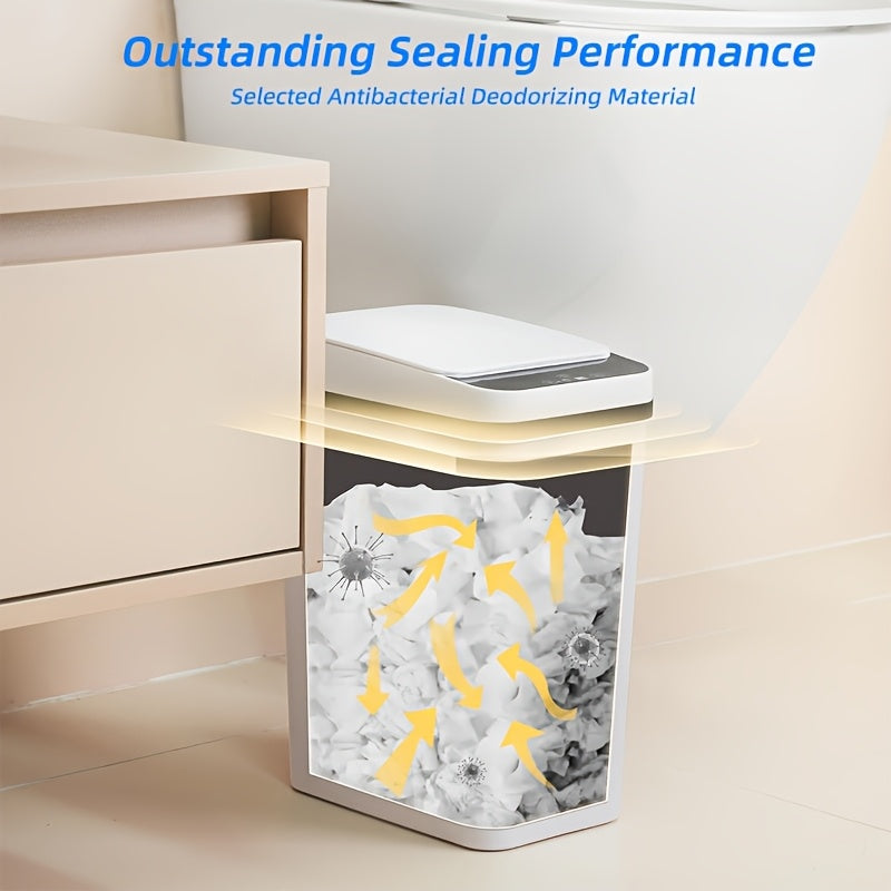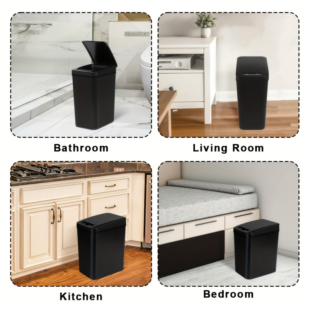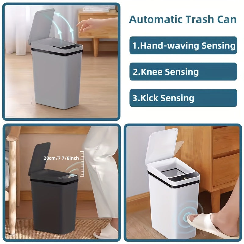 Cubo de basura automático de 8.33 L con tapa oscilante, operación con un botón, negro y blanco