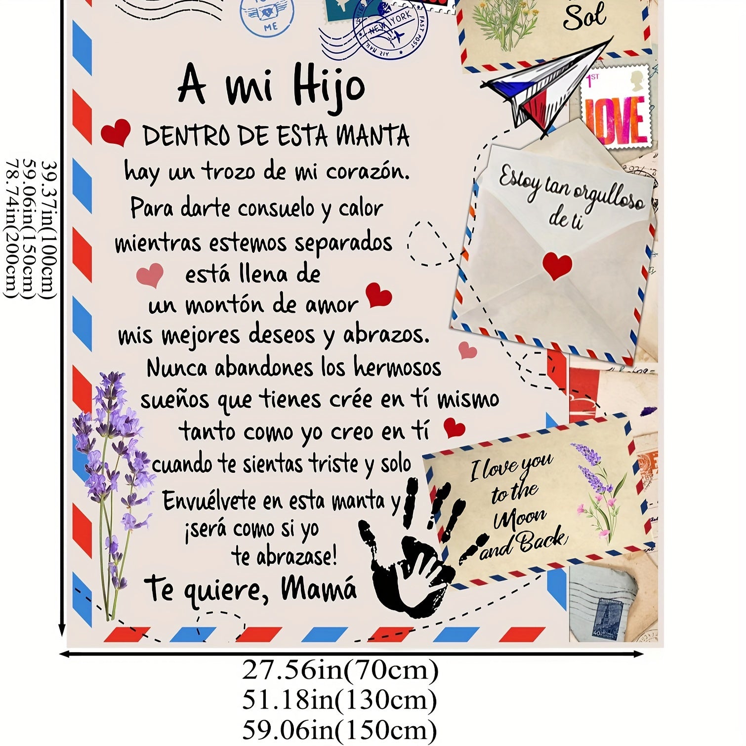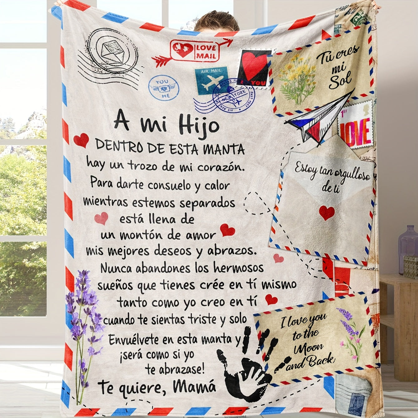 Soft and cozy flannel blanket featuring a Spanish printed letter from Mom to Son. This versatile shawl blanket doubles as a nap throw or casual sofa blanket. A perfect holiday gift that can also be used as a bed or multi-purpose blanket, making it both