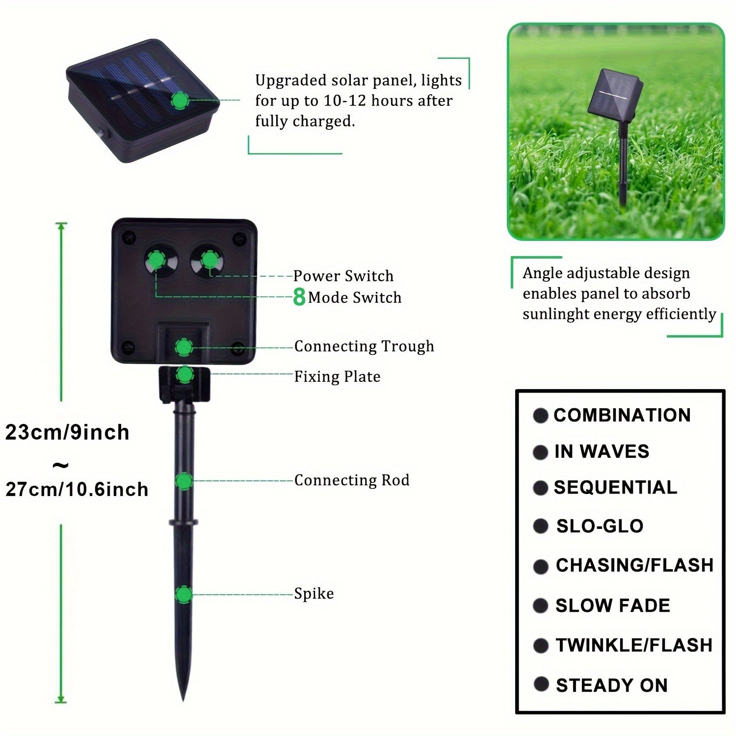 8 modos de iluminación y función de memoria: estas luces de jardín solares con destello tienen el botón de encendido/apagado y el botón de modo. Puedes seleccionar 8 modos diferentes para satisfacer tus diversas necesidades presionando el botón de modo. Y el componente de memoria incorporado guarda la última configuración de modo, por lo que no es necesario restablecerlo