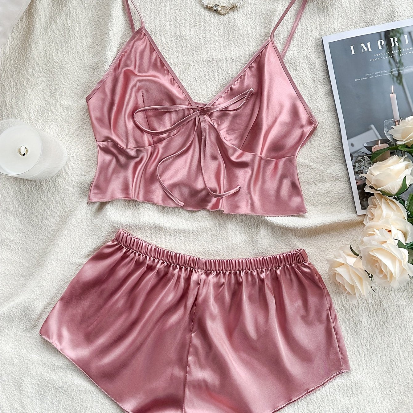 Conjunto de pijama de satén para mujer con top corto sin espalda y pantalones cortos mini para verano