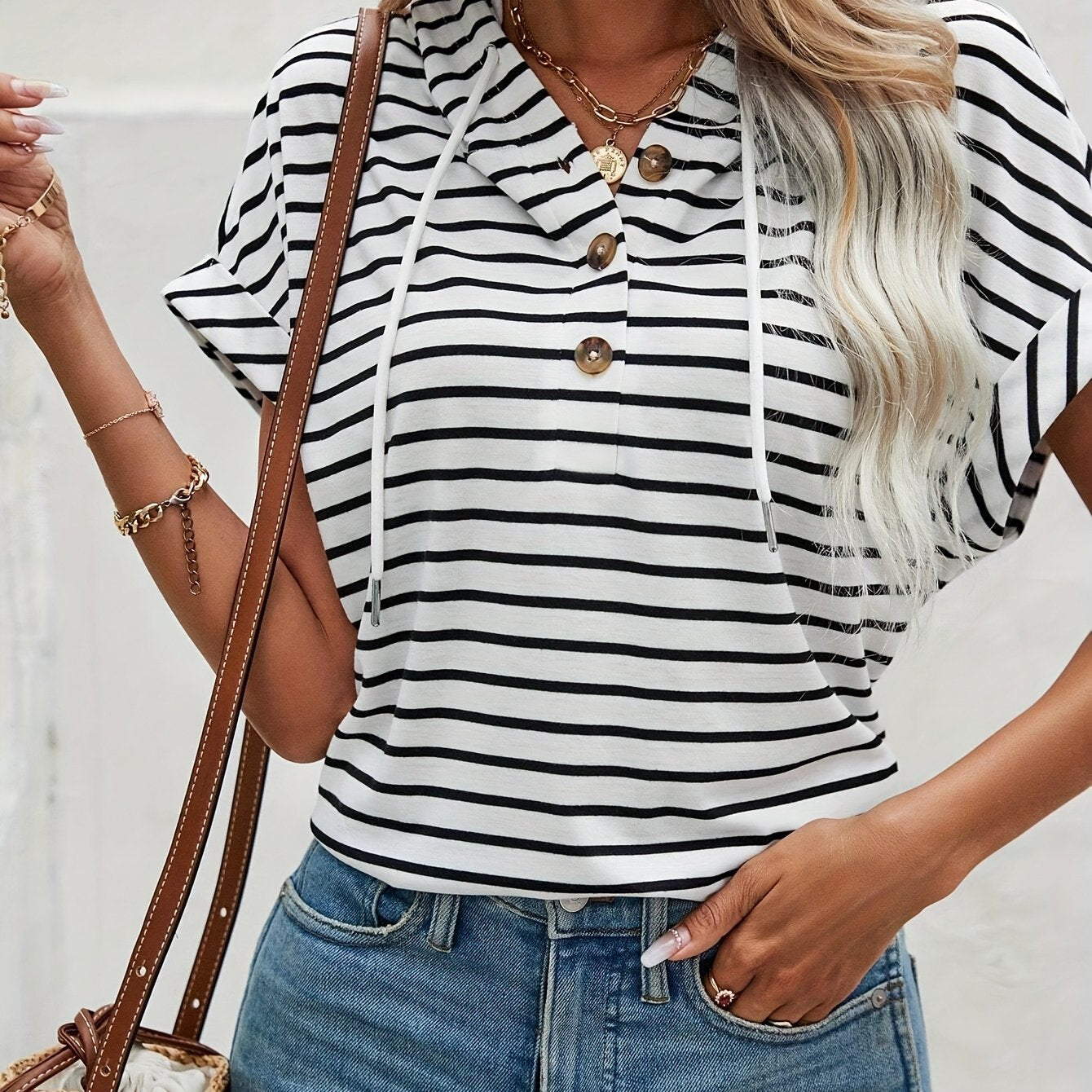Sudadera con capucha de rayas para mujer con botones en la parte delantera, mangas batwing y capucha con cordón
