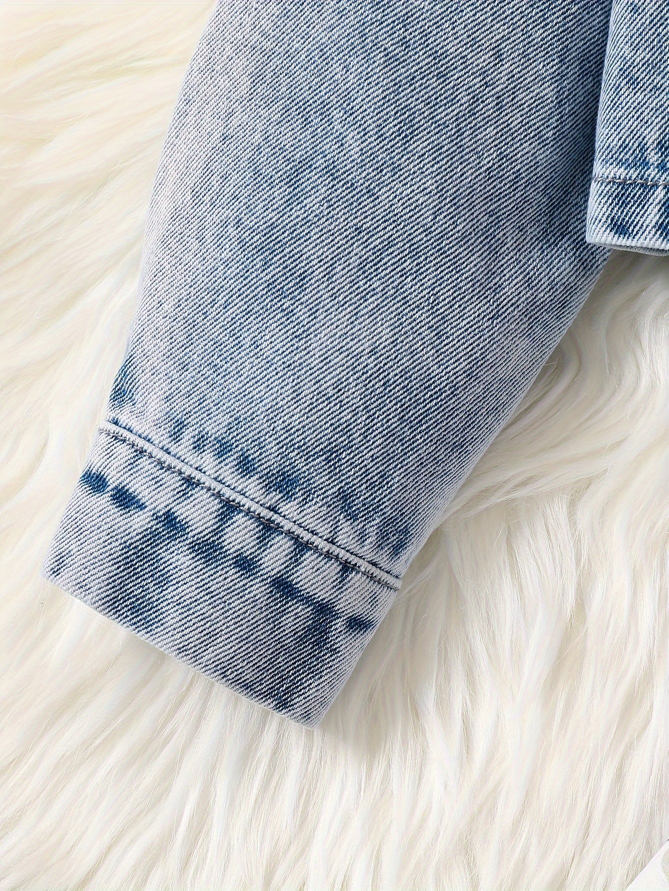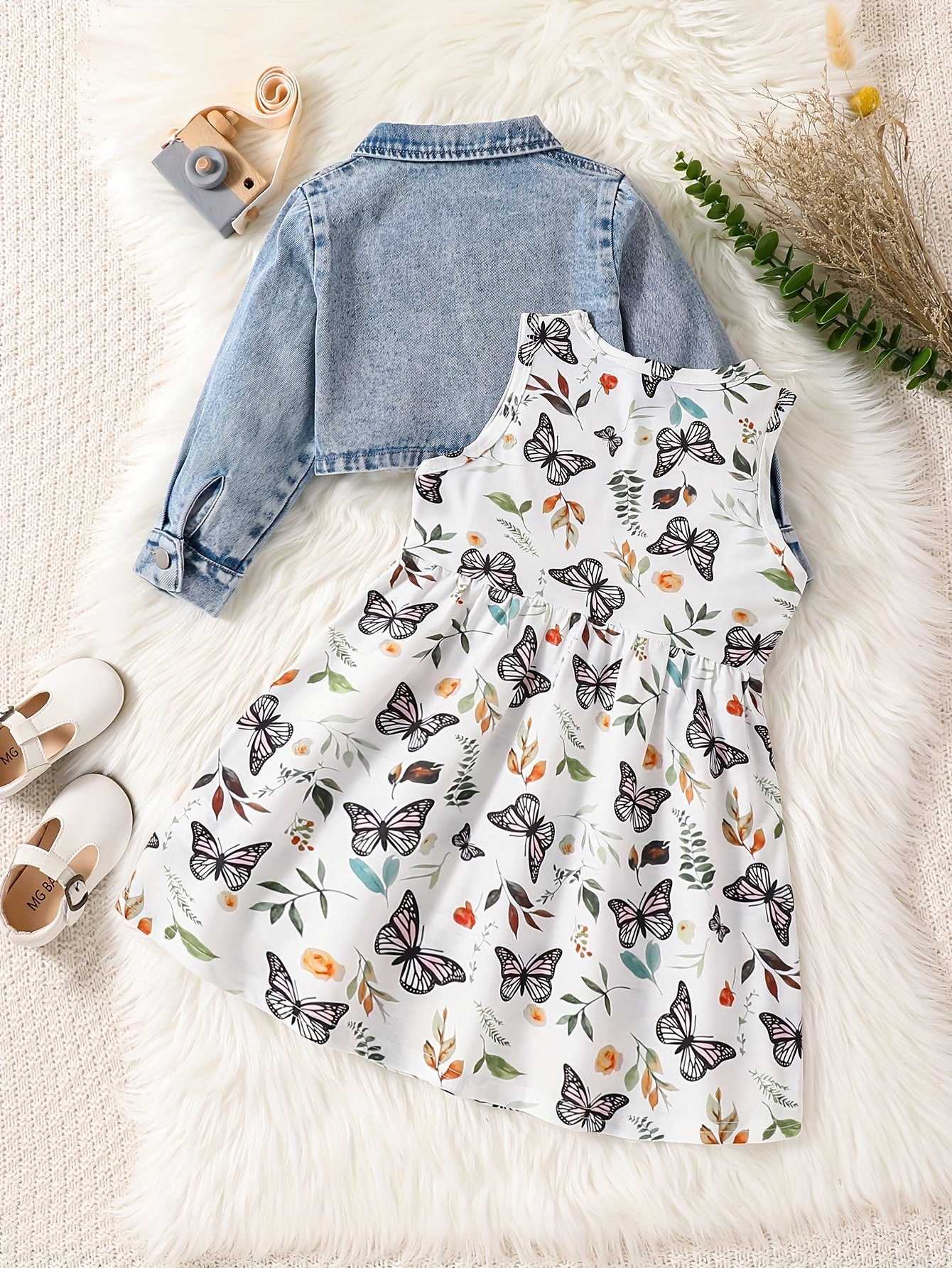 Conjunto de vestido de dos piezas para niñas con patrón de mariposa y cárdigan de mezclilla para primavera y otoño
