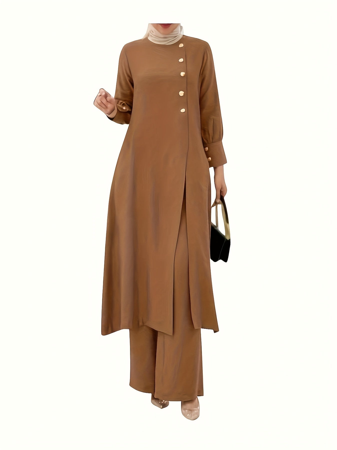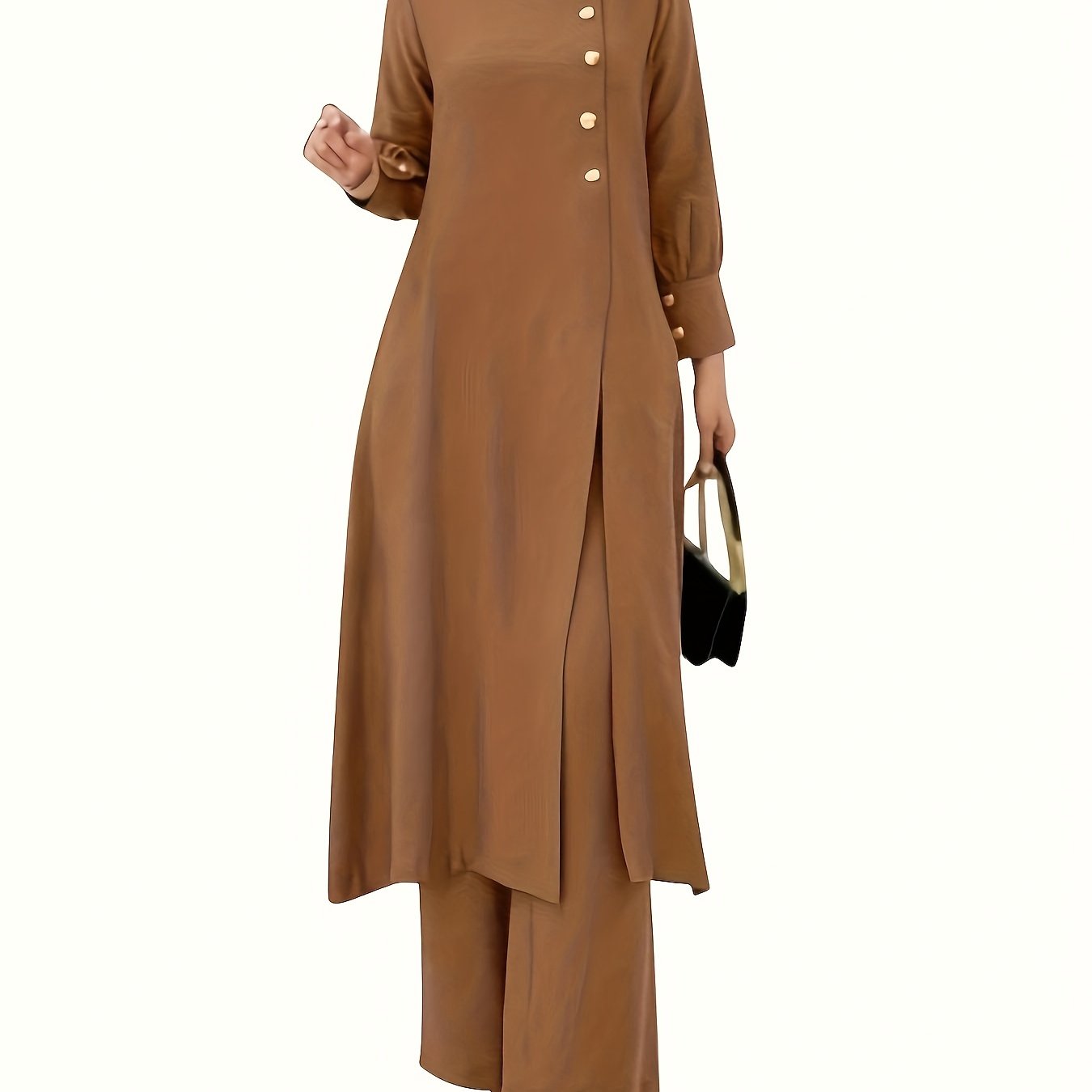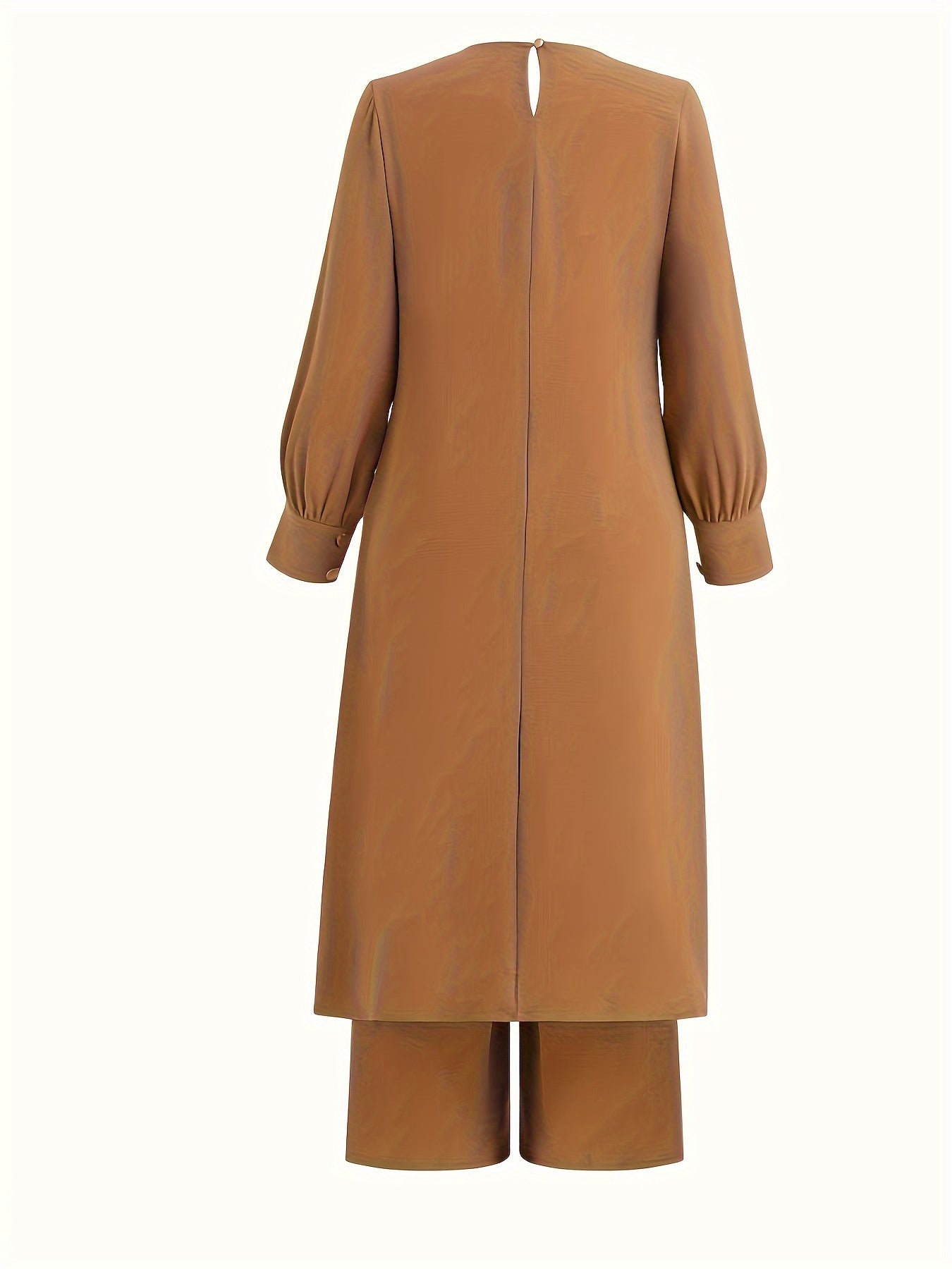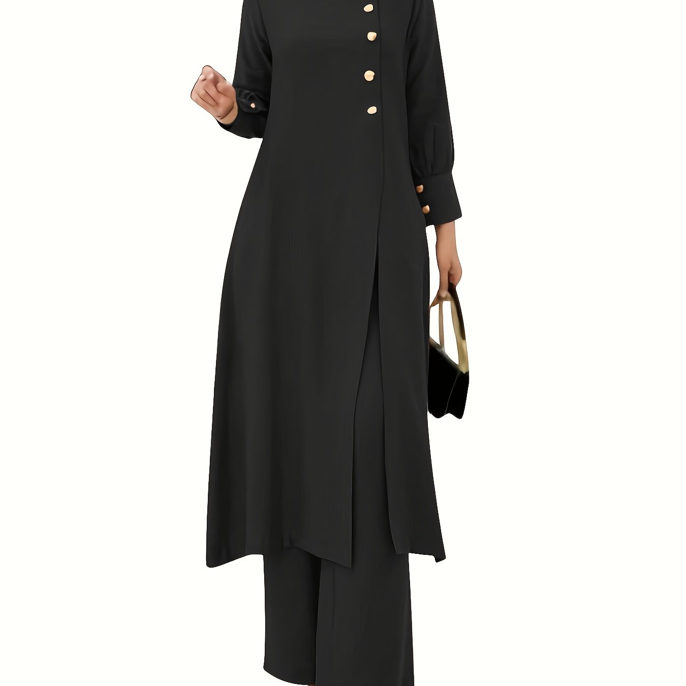 Conjunto de dos piezas de poliéster negro con mangas de farol y pantalones de pierna ancha para mujer