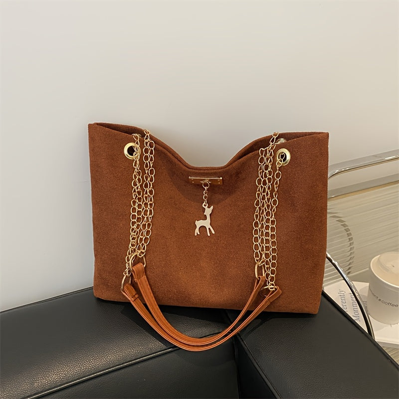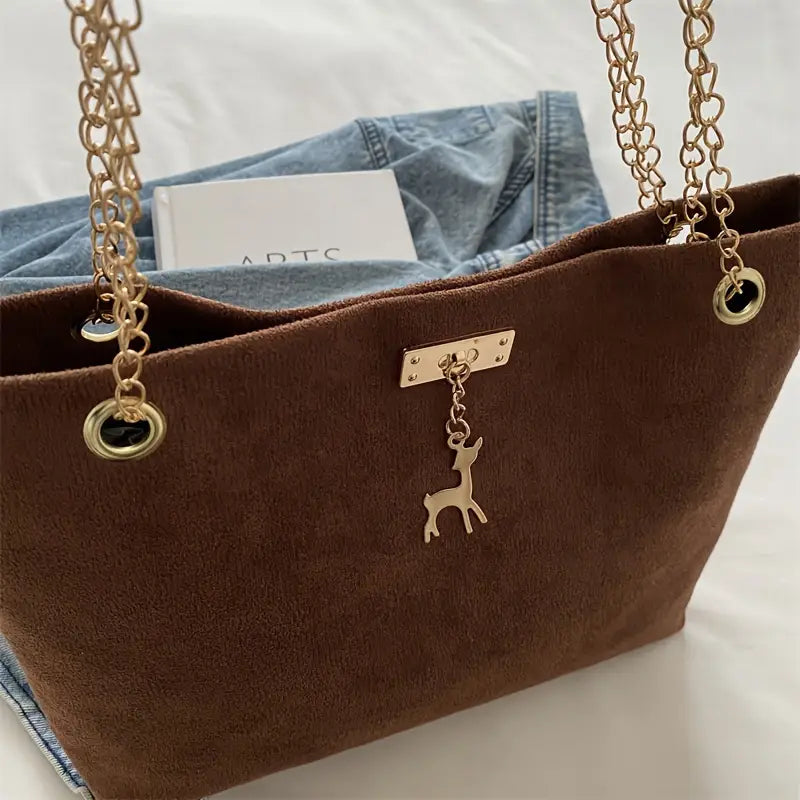Bolso tote para mujer con colgante de ciervo, gran capacidad, cierre magnético de PU negro, correas de cadena