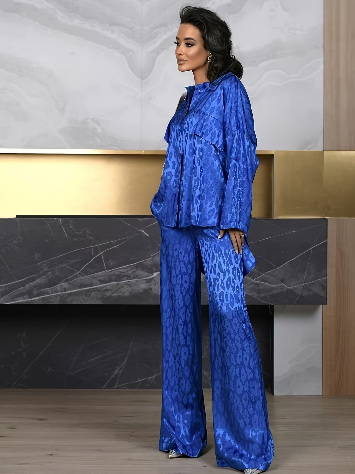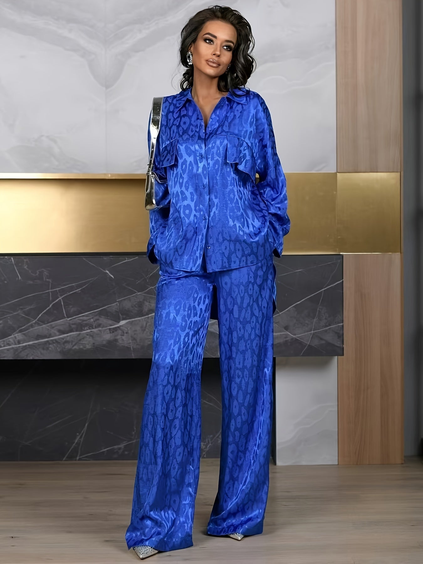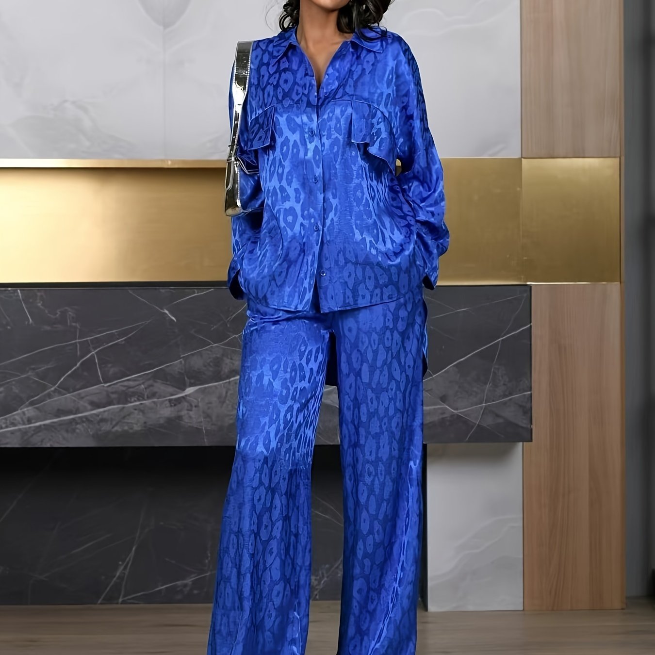 Conjunto de dos piezas con estampado de leopardo, manga larga, casual, tejido de poliéster y spandex
