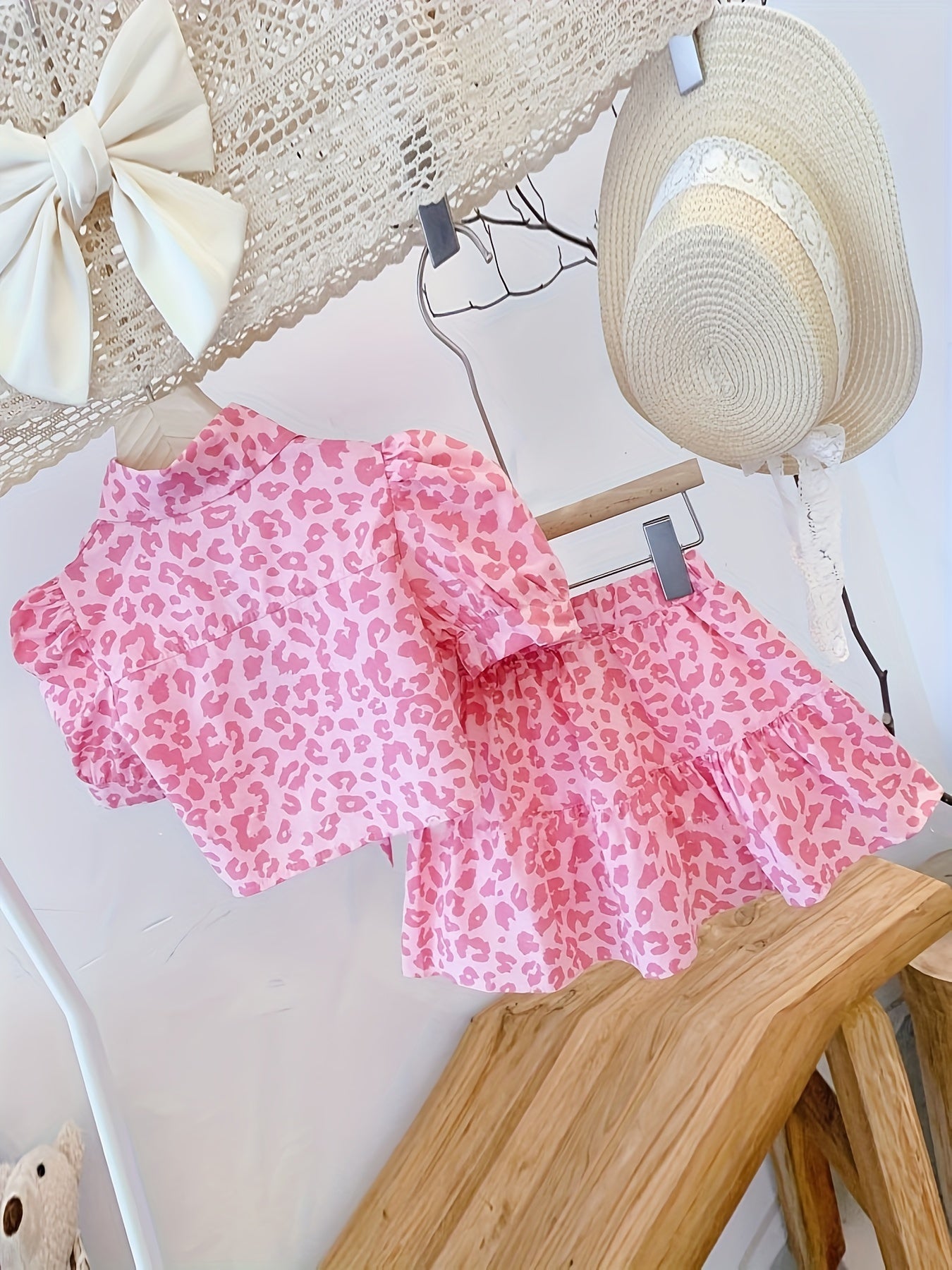 Conjunto de leopardo rosa para niñas con camisa de manga corta y falda con volante