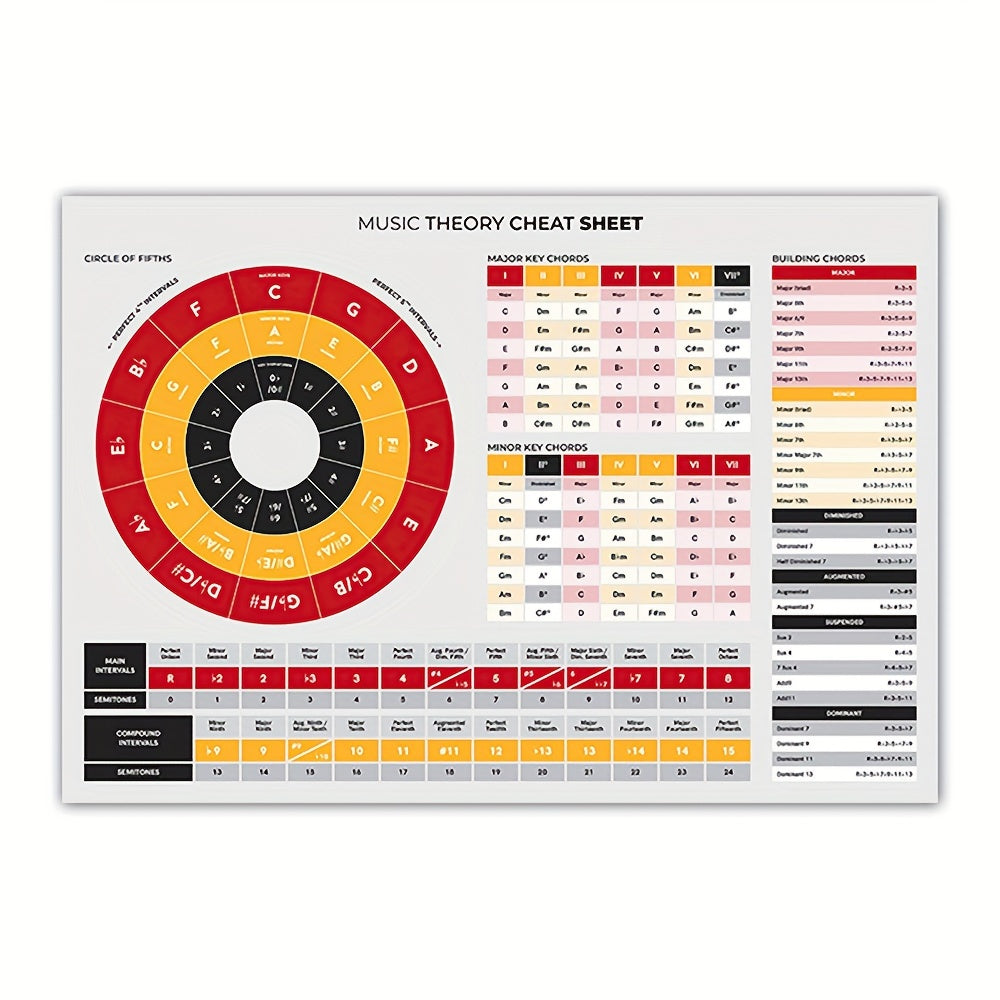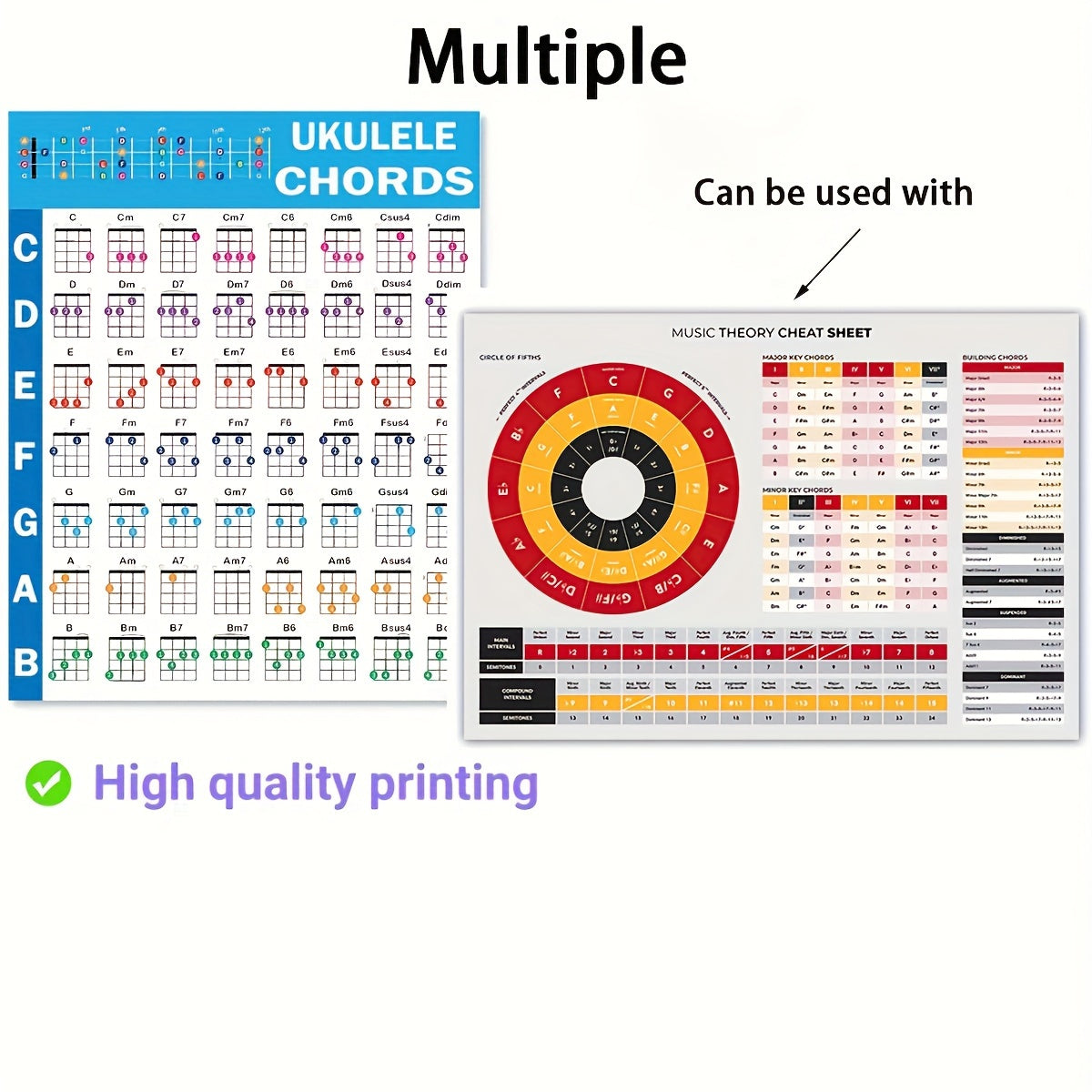 Hojas de trucos de acordes de ukelele con póster y referencia de teoría musical en múltiples colores