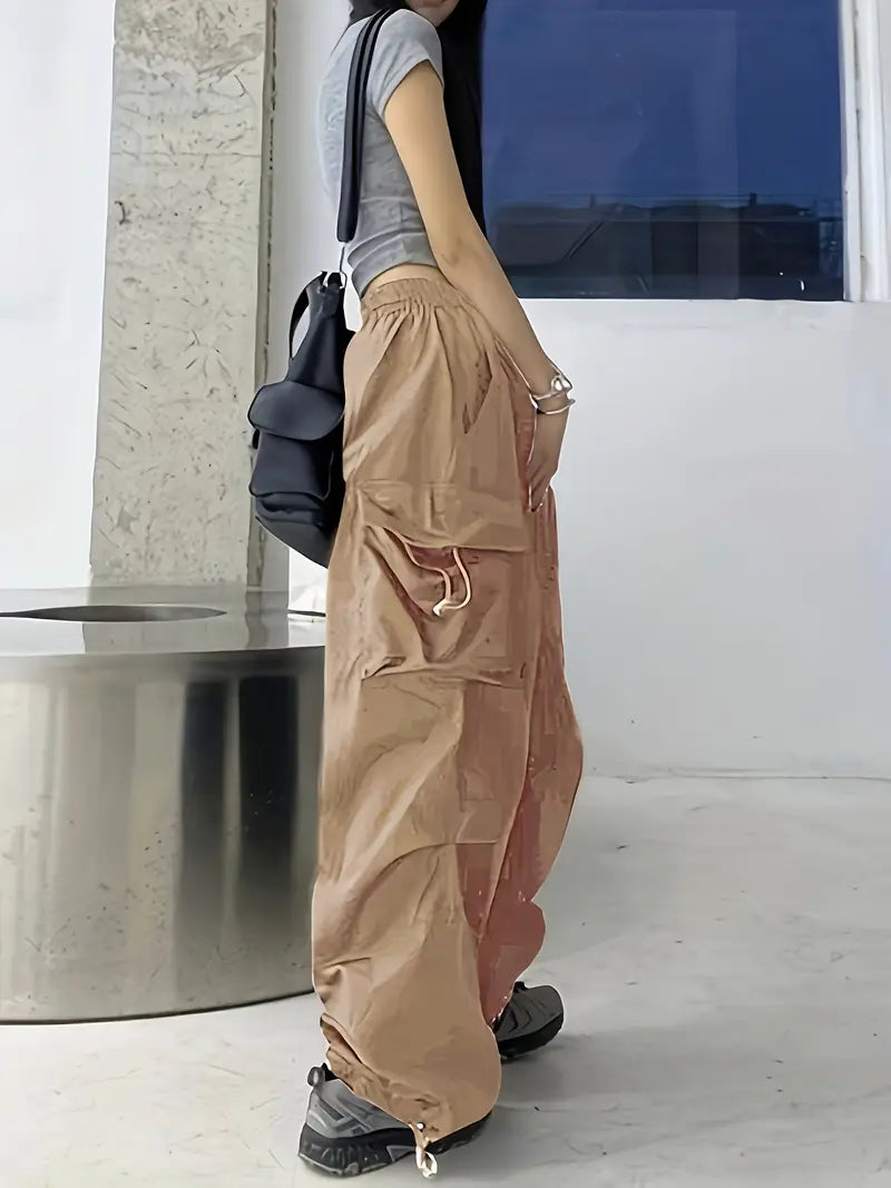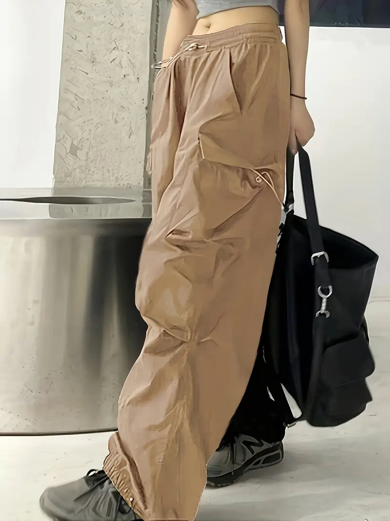 Pantalones cargo de pierna ancha para mujer con bolsillos con solapa y cierre de cordón para primavera y verano