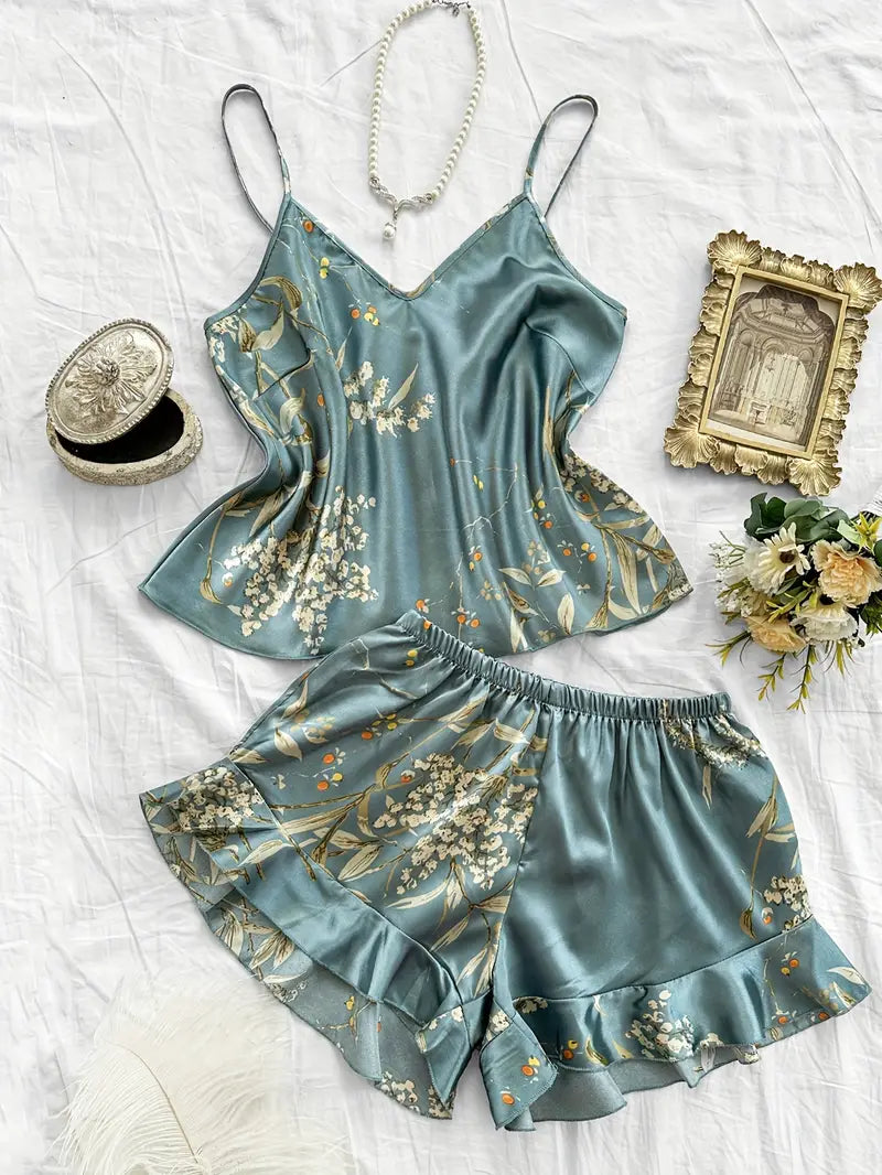 Conjunto de pijama de satén con estampado de cerezas para mujer, talla grande, camisón y pantalones cortos