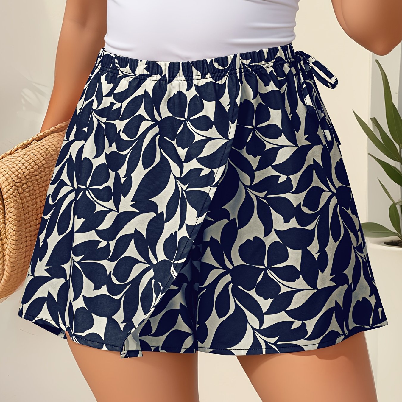Falda pantalón de estampado floral para mujer, con falso cordón, ligera, de poliéster, azul marino