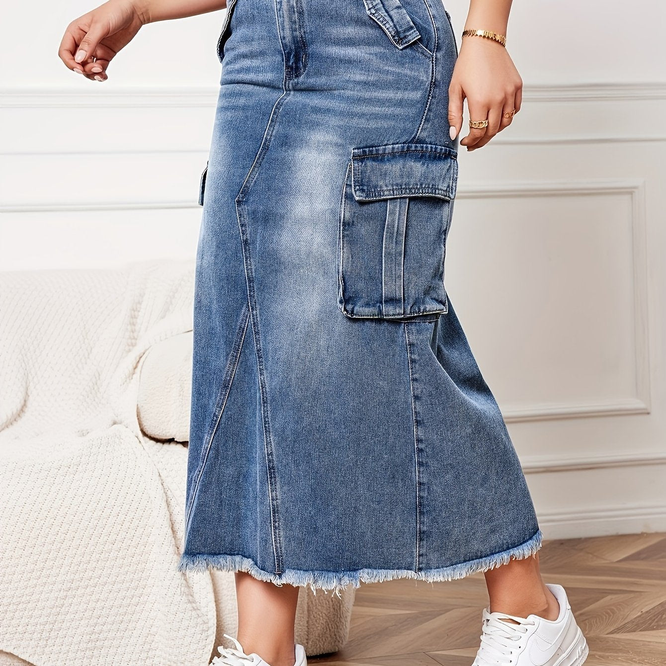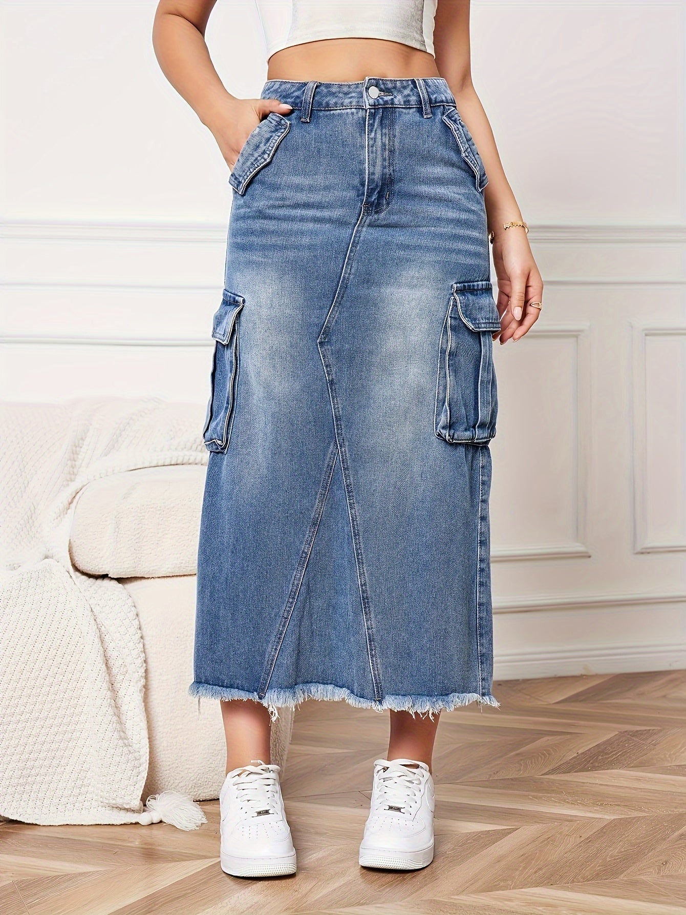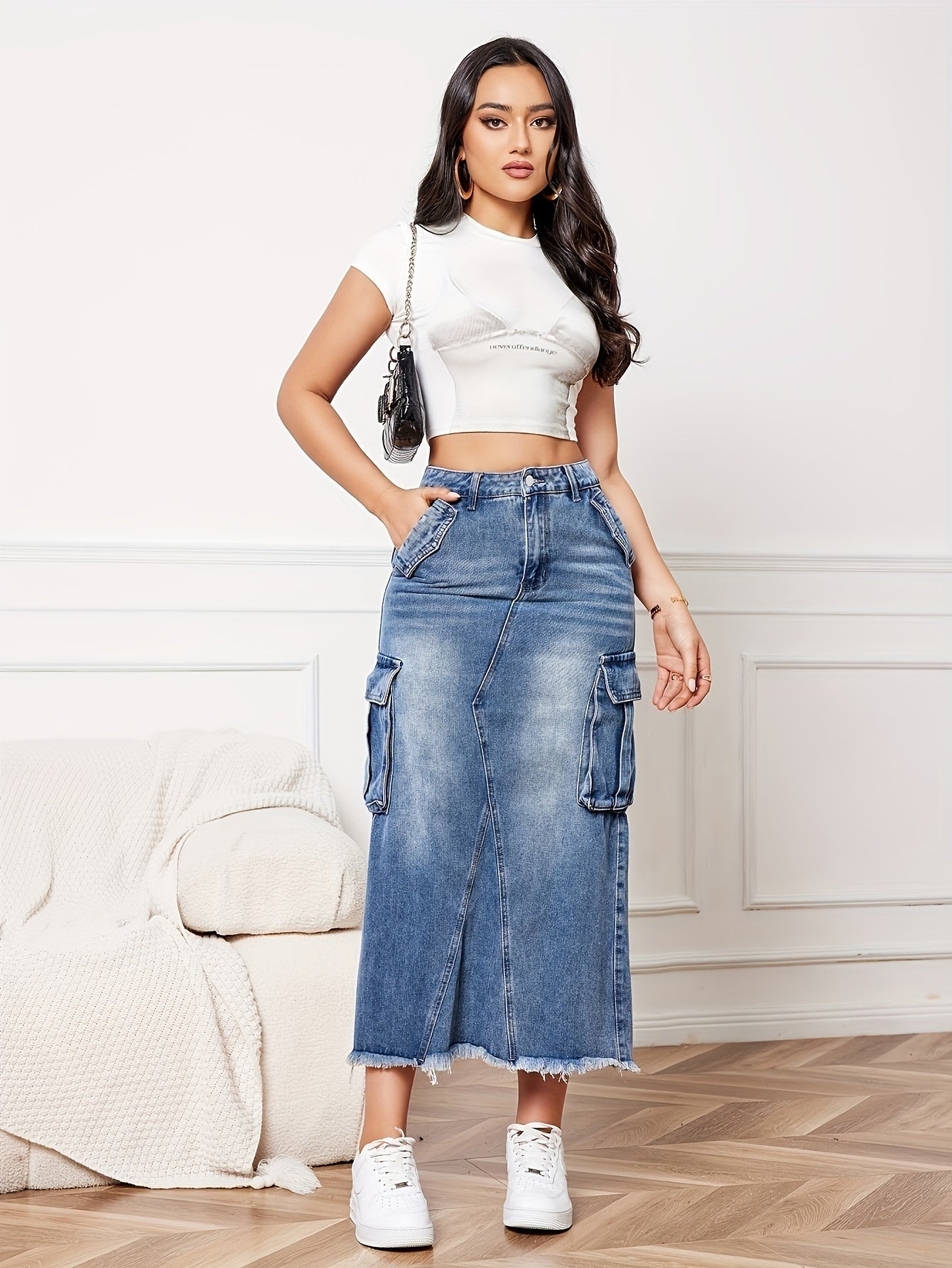 Falda de mezclilla recta de talle alto en azul claro para mujer con bolsillos