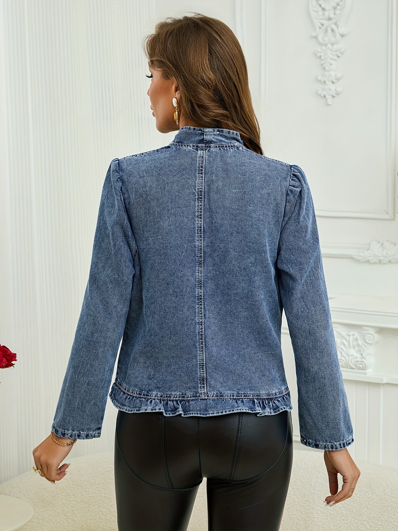 Cárdigan de mezclilla de manga larga para mujer con volantes, color sólido, ropa de abrigo de primavera