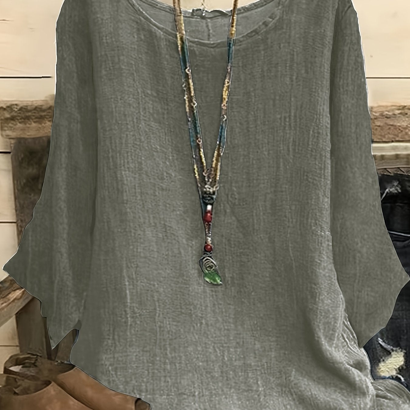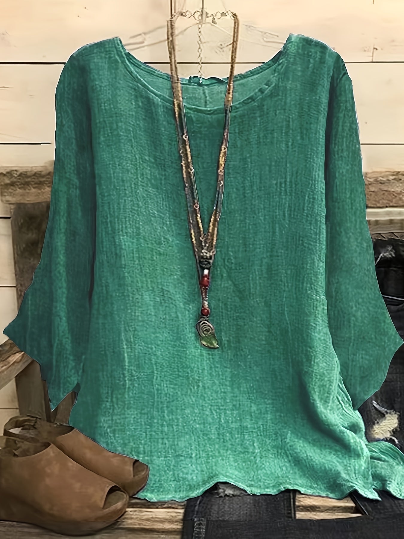 Camiseta de manga larga para mujer talla plus, de cuello redondo, de color sólido, ajuste holgado y relajado