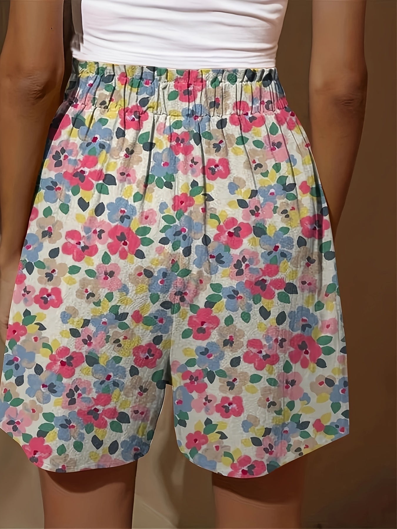 Pantalones cortos casuales florales con cinturilla fruncida para mujer talla plus con bolsillos de parche