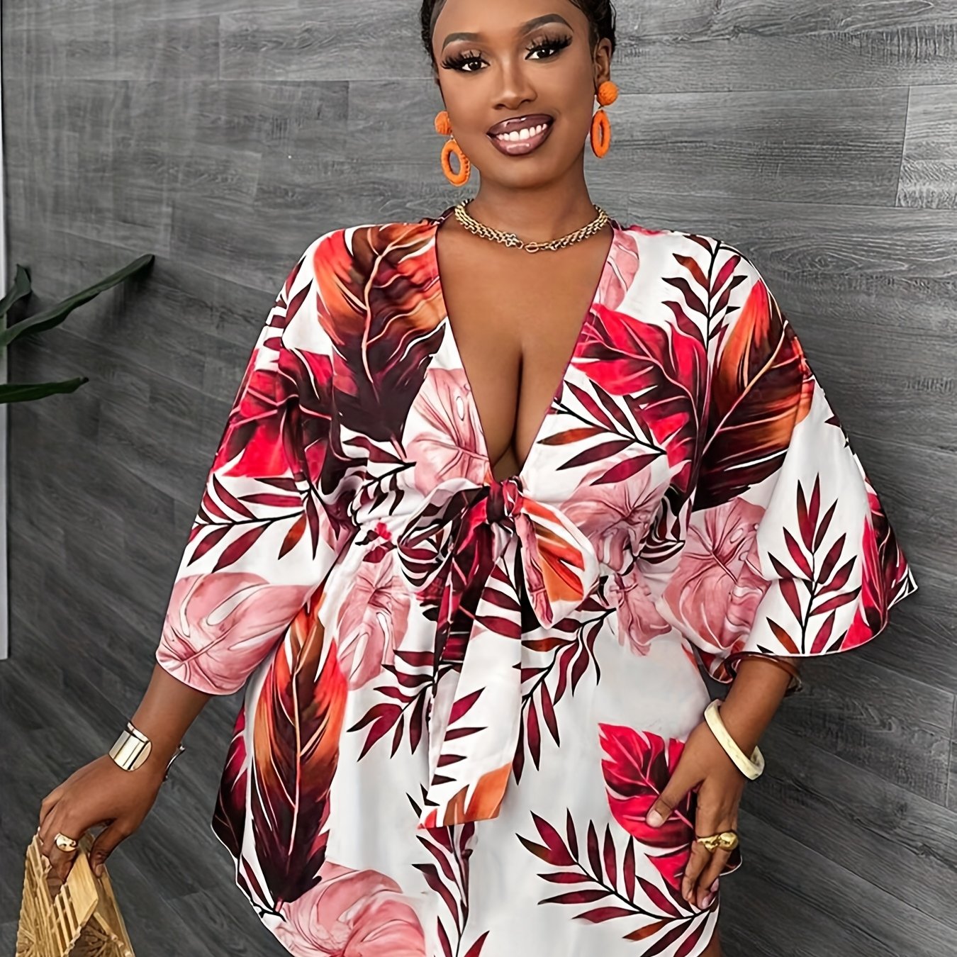 Mono casual de verano con escote en V y estampado tropical para mujer de tallas grandes