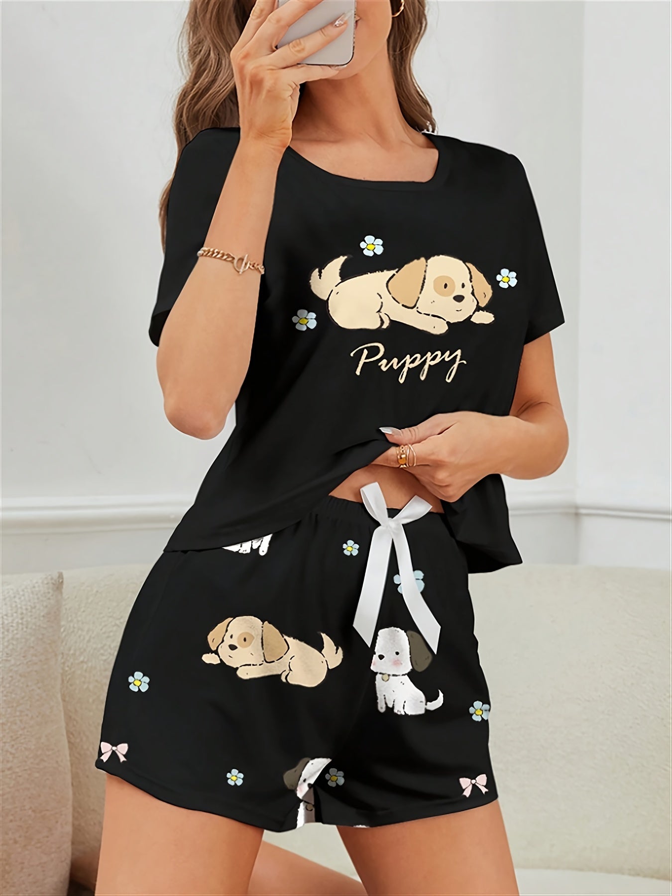 Conjunto de pijama para mujer con camiseta de manga corta con estampado de cachorros y pantalones cortos para adultos